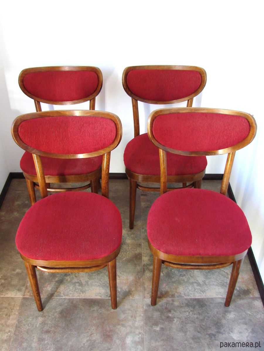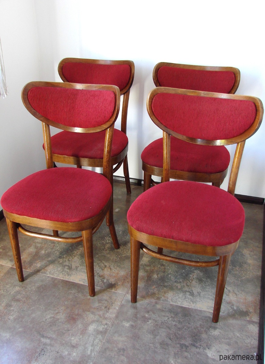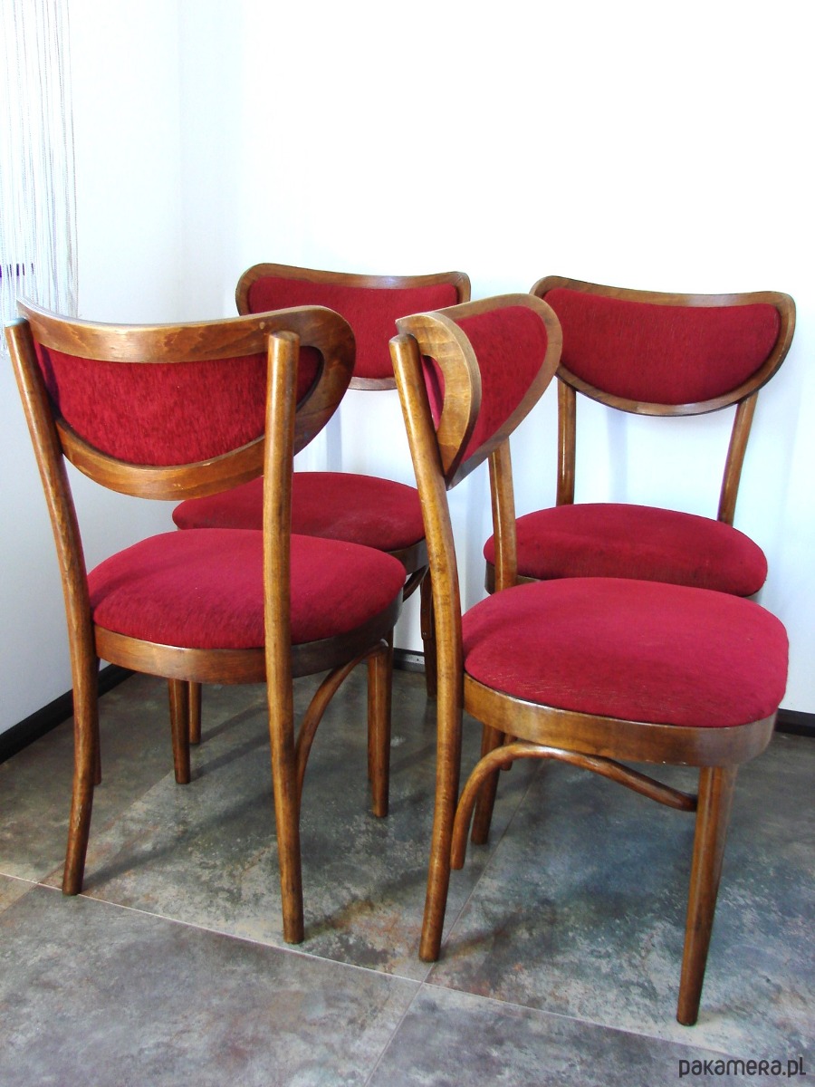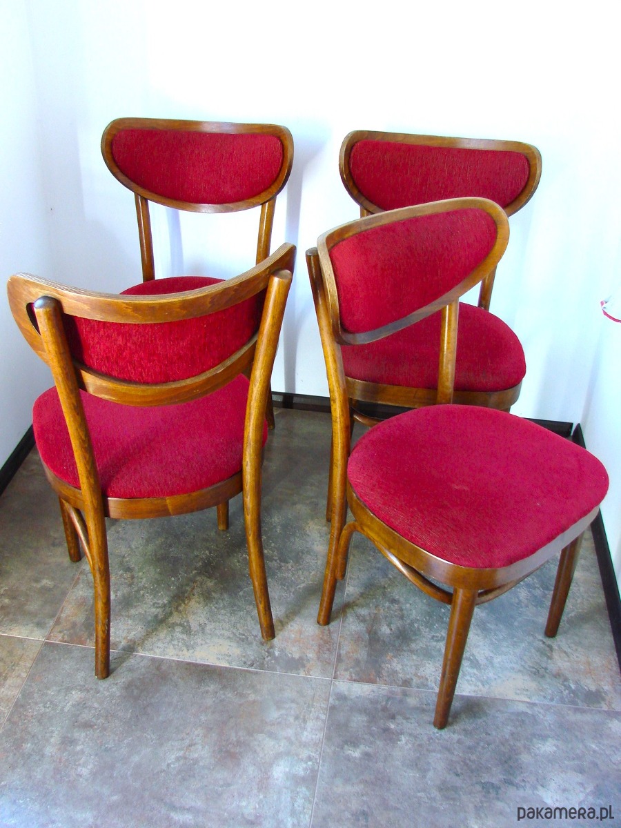 Komplet 4 oryginalnych krzeseł typu Thonet, wyprodukowanych w zakładach w Radomsku w Polsce w latach 60. Krzesła w klasycznym stylu, wykonane z giętego drewna. Zachowane w dobrym stanie, z naturalną patyną czasu. Konstrukcja stabilna, meble w oryginalnym, nerenowowanym stanie – idealne dla kolekcjonerów i miłośników autentycznego designu vintage.