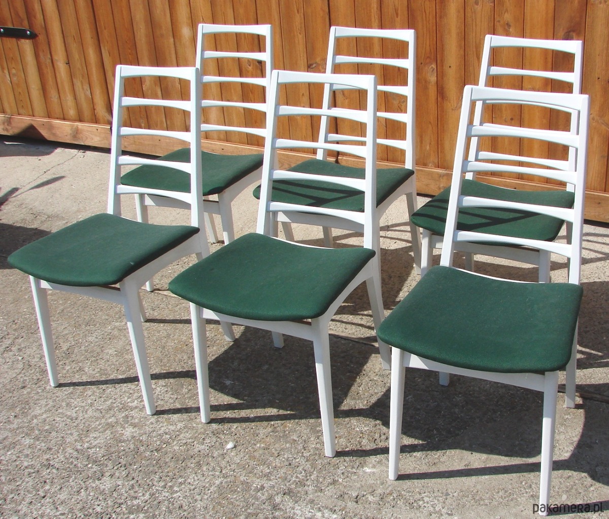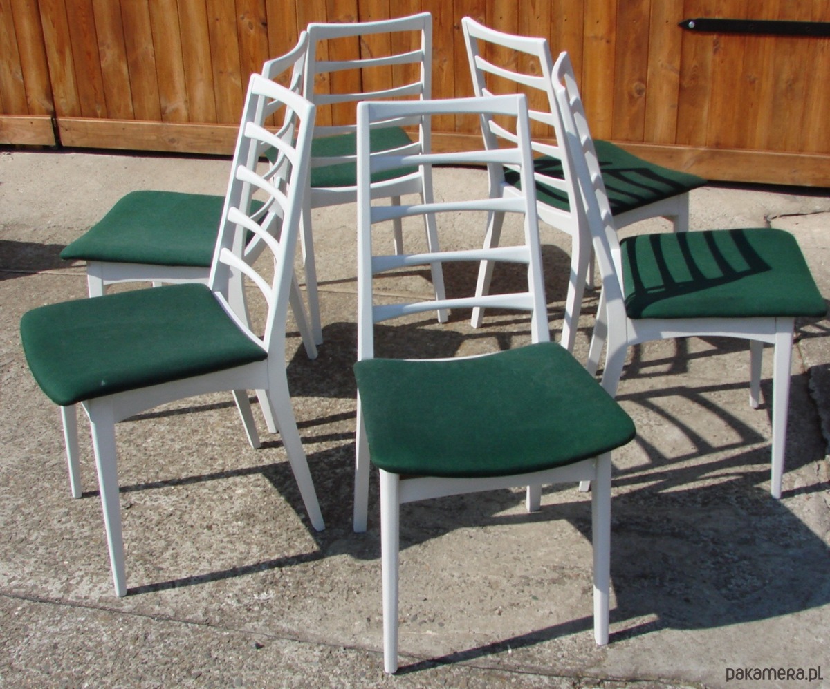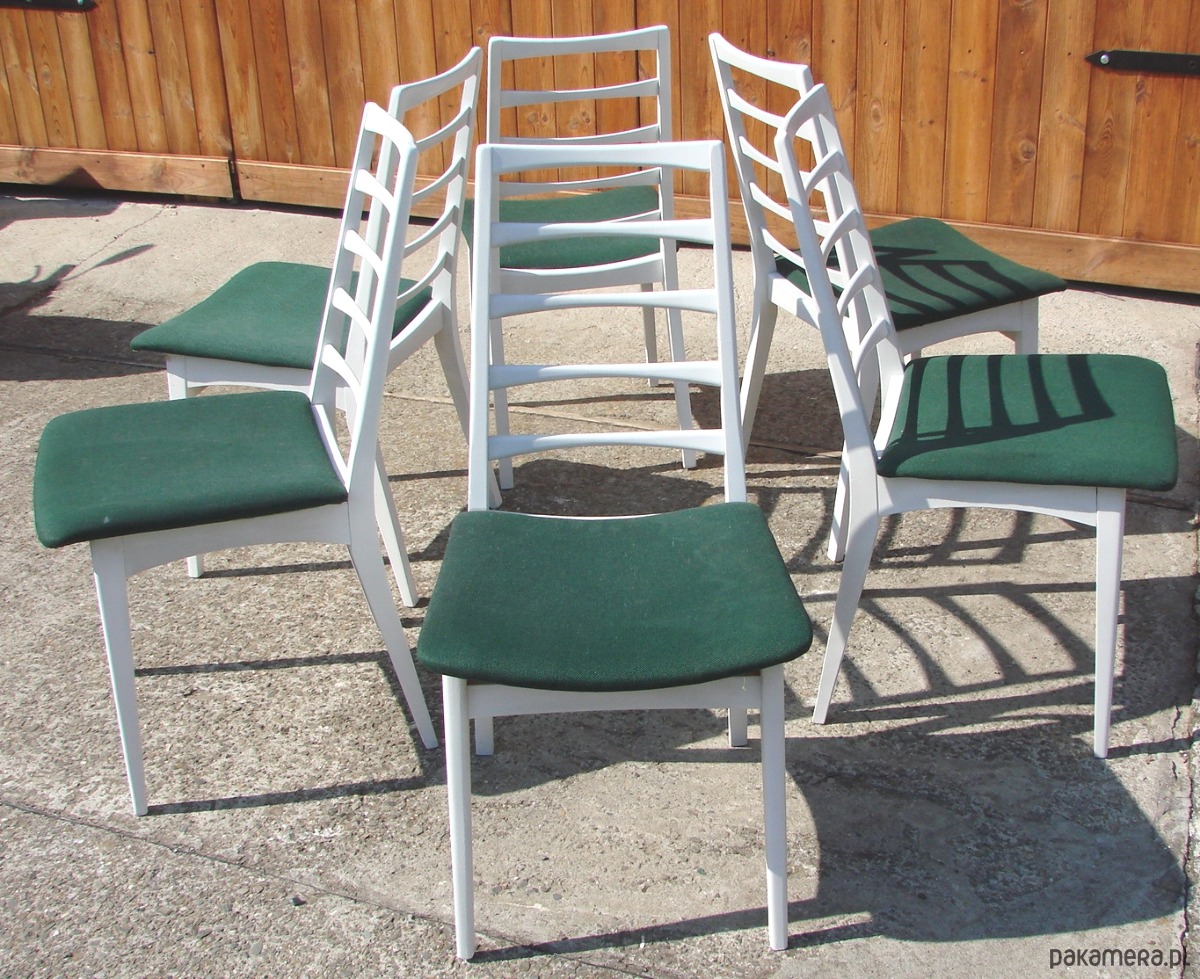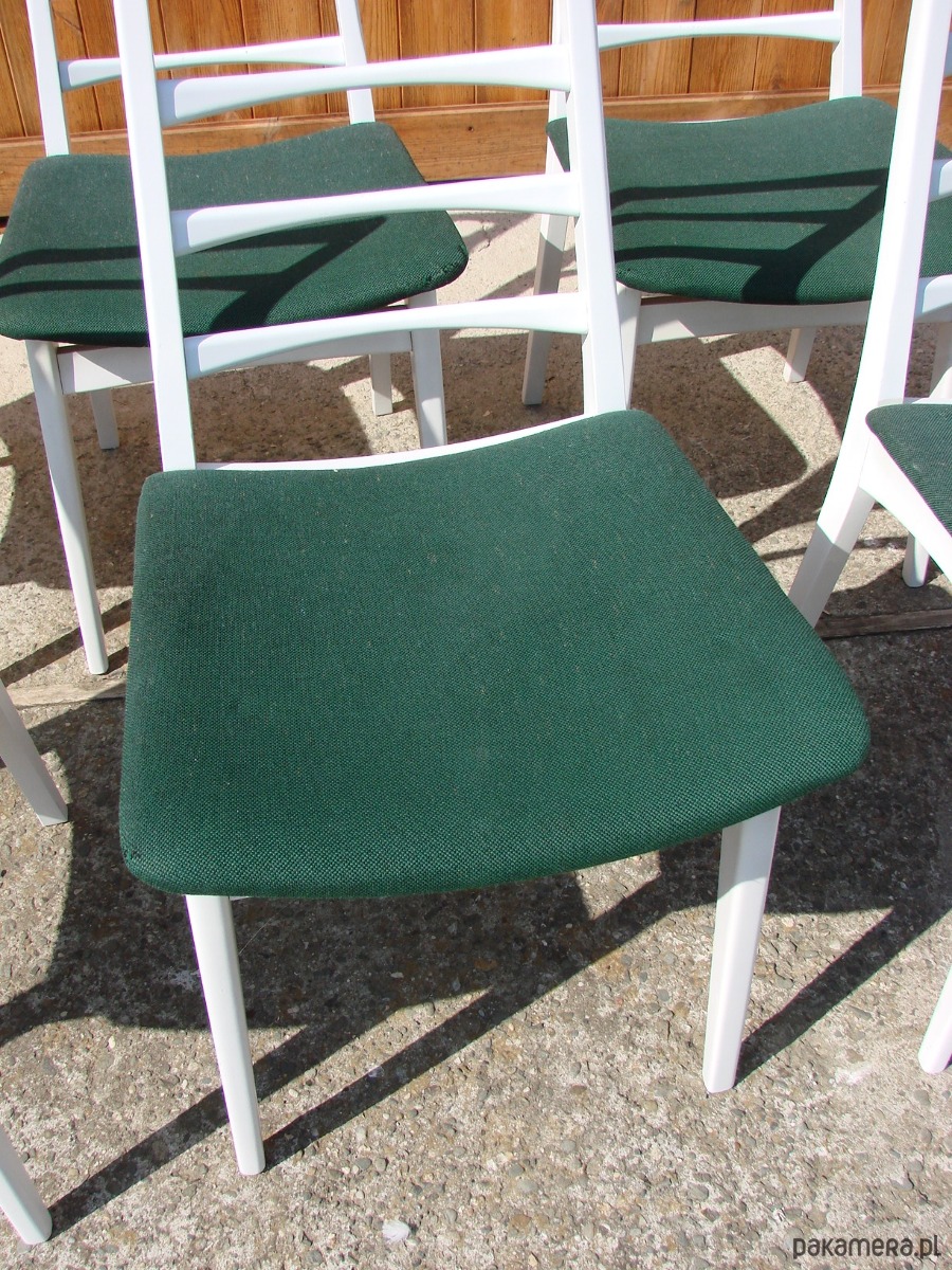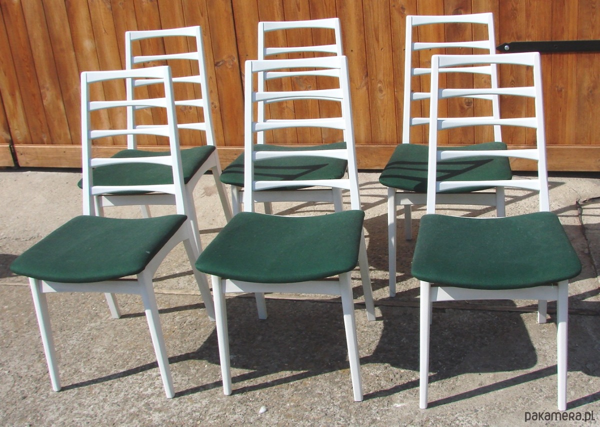 Komplet sześciu krzeseł pochodzących z lat 70. XX wieku. Klasyczna forma charakterystyczna dla wzornictwa tego okresu, łącząca prostą, funkcjonalną linię z solidnym drewnianym stelażem.