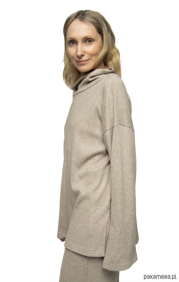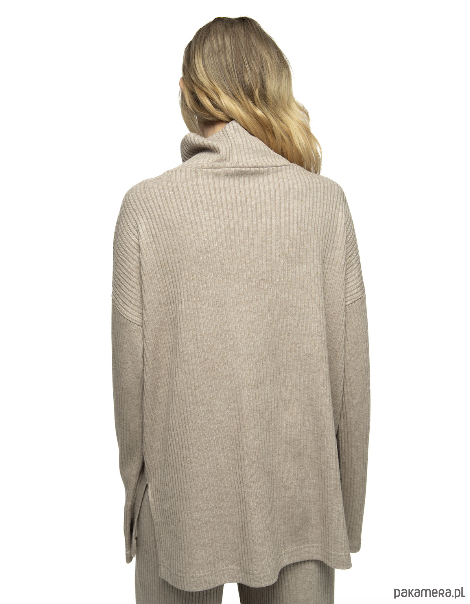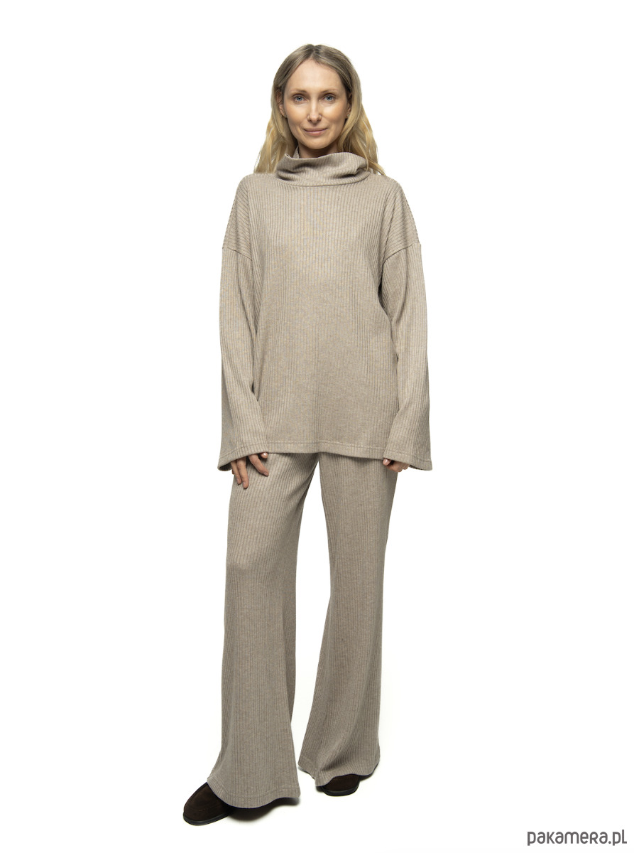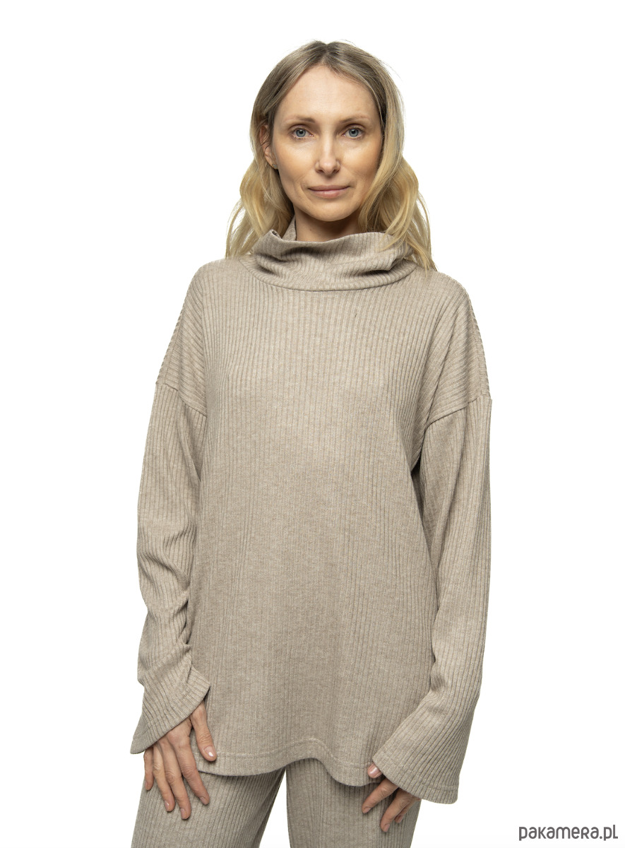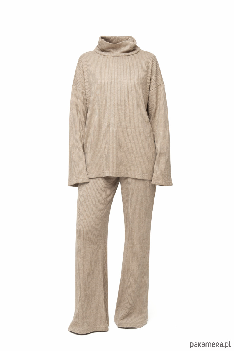 Wykonany z miękkiej, przyjemnej w dotyku dzianiny, zapewnia wygodę przez cały dzień. Luźna bluza z wysokim golfem oraz szerokie spodnie tworzą modny, oversize’owy zestaw, który pięknie układa się na sylwetce.