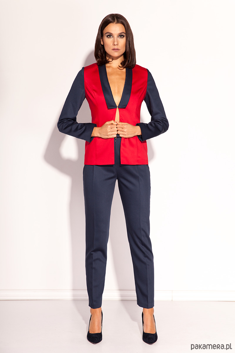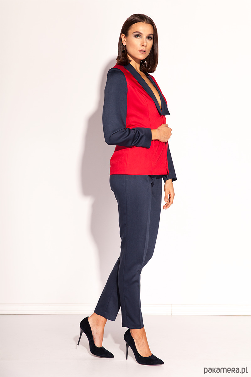 Komplet żakiet i spodnie uszyte z czerwonej i granatowej wiskozy z poliestrem. Tkanina jest lekko elastyczna. Żakiet dopasowany, na wiskozowej podszewce z zapięciem na haftkę, długość około 72 cm. Spodnie o fasonie cygaretek z kantami. Pasek w talii, zamek kryty z przodu, długość około 105 cm