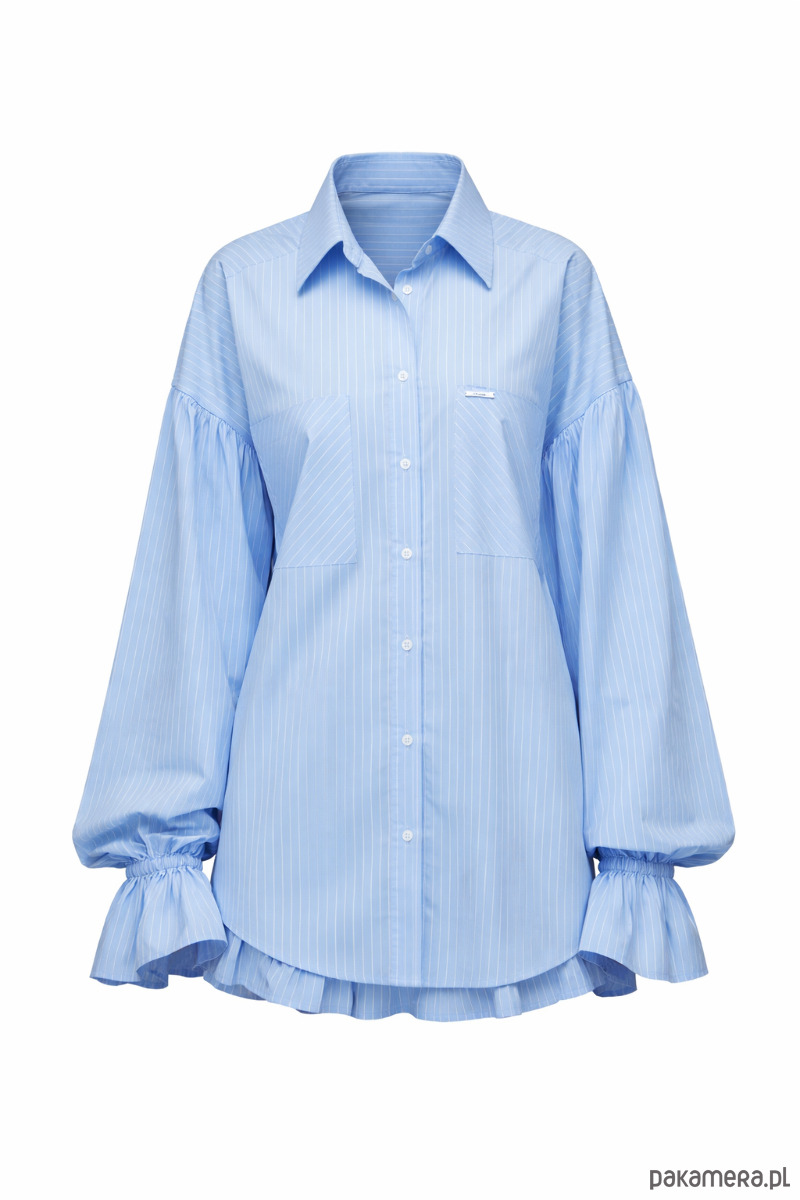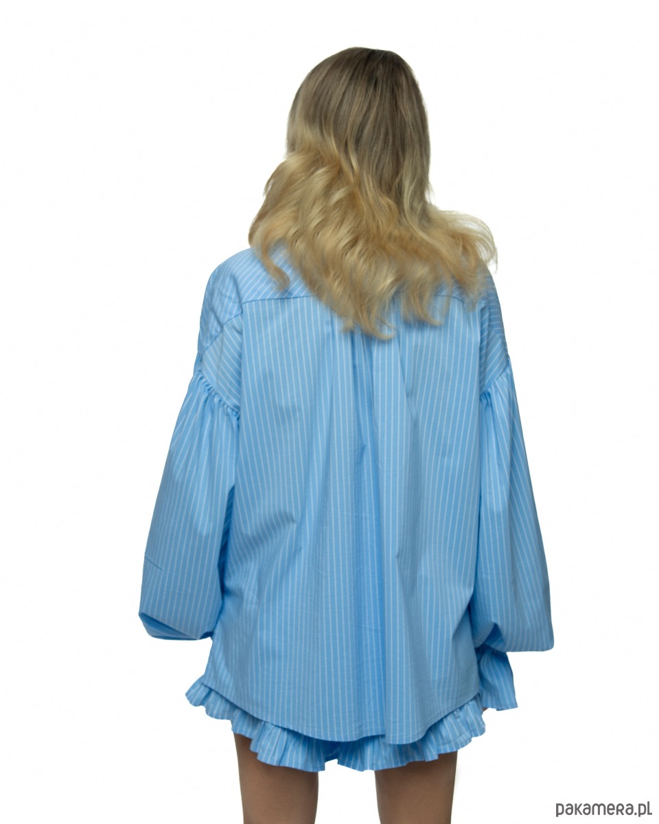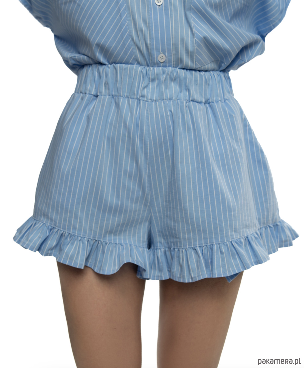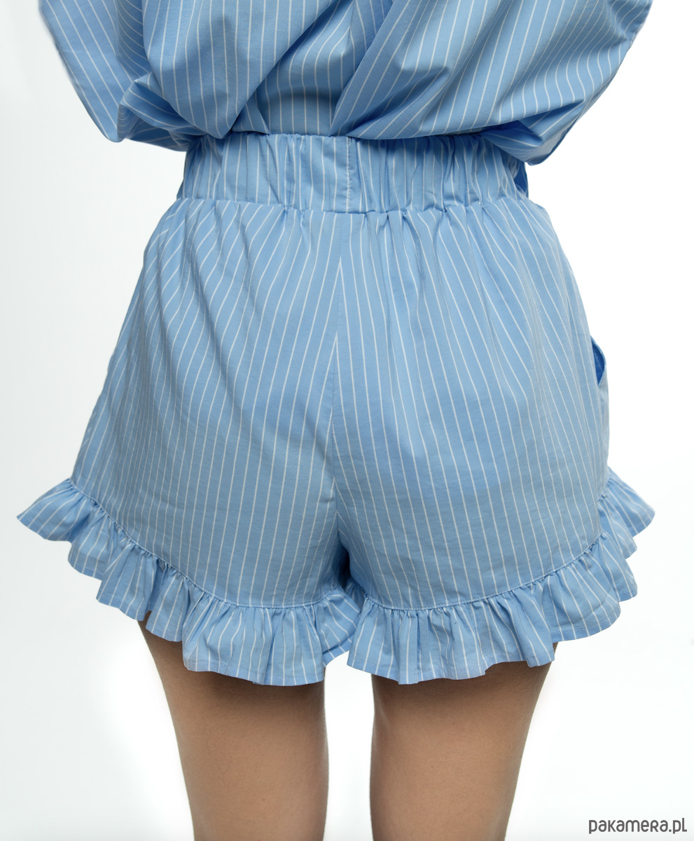Ponadto koszula ma klasyczny kołnierzyk, zapięcie na guziki, ozdobne marszczenia na rękawach i rozcięcia po bokach, dzięki temu nadaje jej nowoczesny i kobiecy charakter. Szorty posiadają elastyczny pas, dlatego dopasowuje się do sylwetki, również praktyczne boczne kieszenie. Falbanka dodaje całości subtelnego uroku.