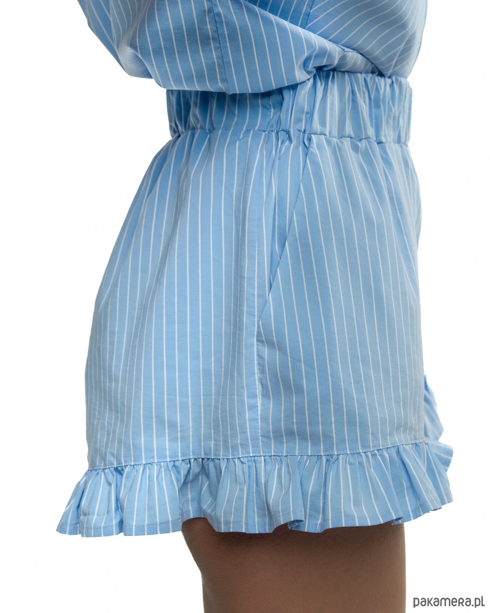 Ponadto koszula ma klasyczny kołnierzyk, zapięcie na guziki, ozdobne marszczenia na rękawach i rozcięcia po bokach, dzięki temu nadaje jej nowoczesny i kobiecy charakter. Szorty posiadają elastyczny pas, dlatego dopasowuje się do sylwetki, również praktyczne boczne kieszenie. Falbanka dodaje całości subtelnego uroku.