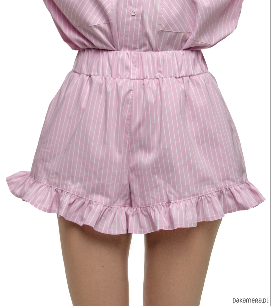 Ponadto koszula ma klasyczny kołnierzyk, zapięcie na guziki, ozdobne marszczenia na rękawach i rozcięcia po bokach, dzięki temu nadaje jej nowoczesny i kobiecy charakter. Szorty posiadają elastyczny pas, dlatego dopasowuje się do sylwetki, również praktyczne boczne kieszenie. Falbanka dodaje całości subtelnego uroku.