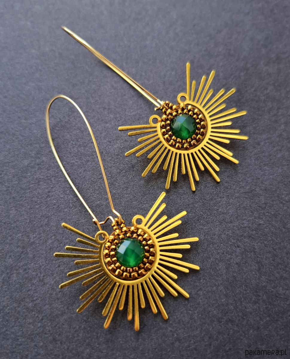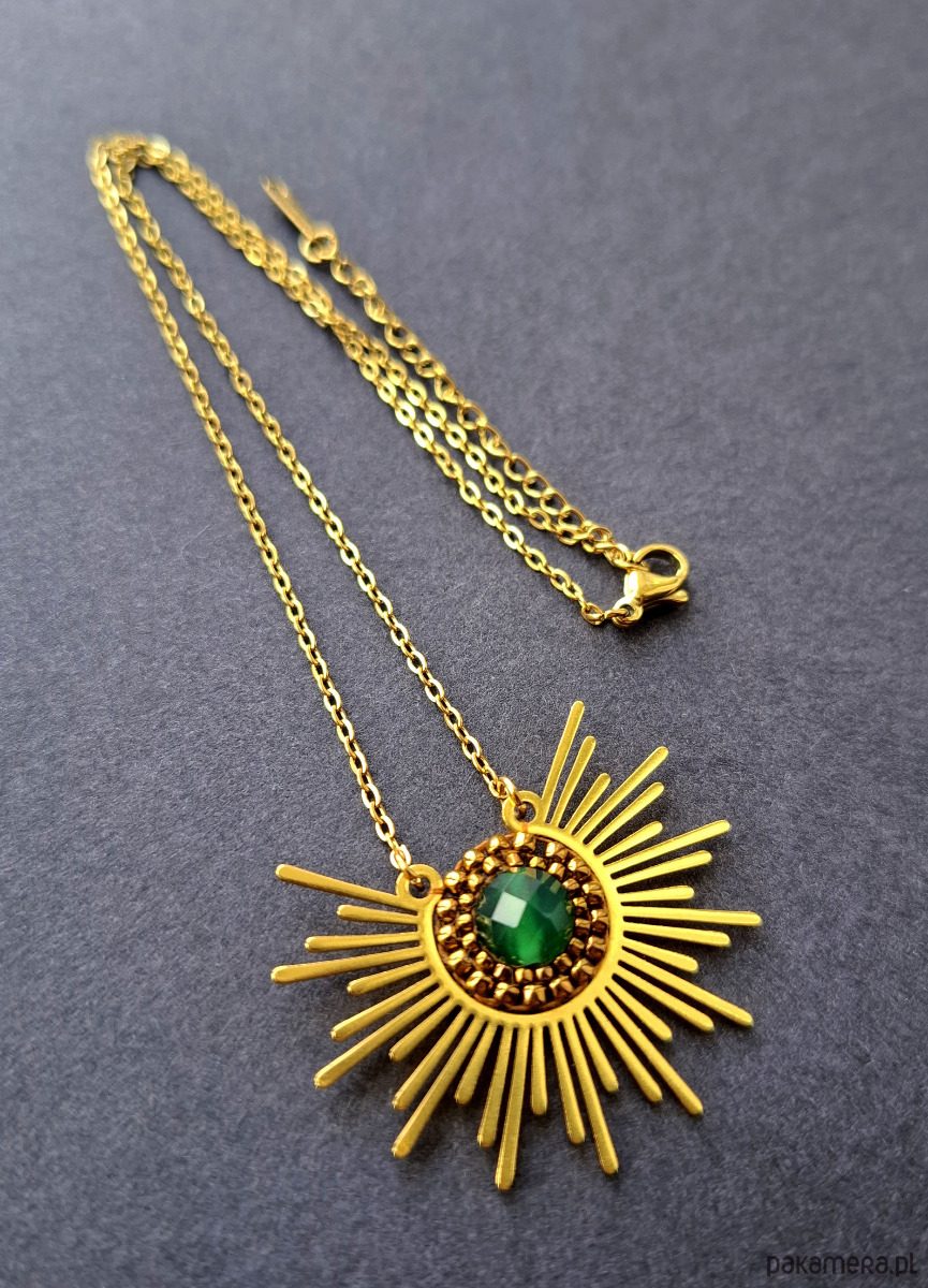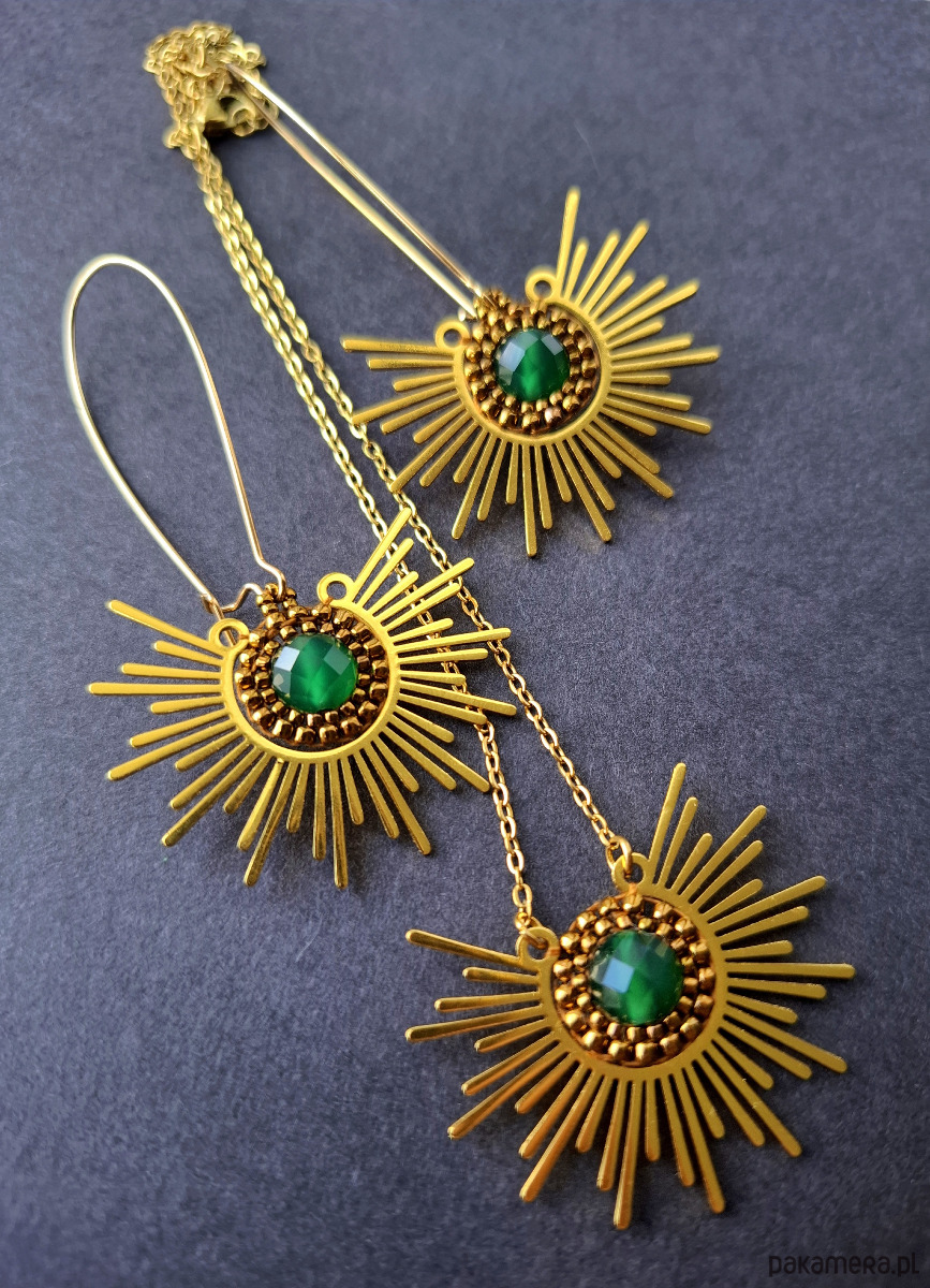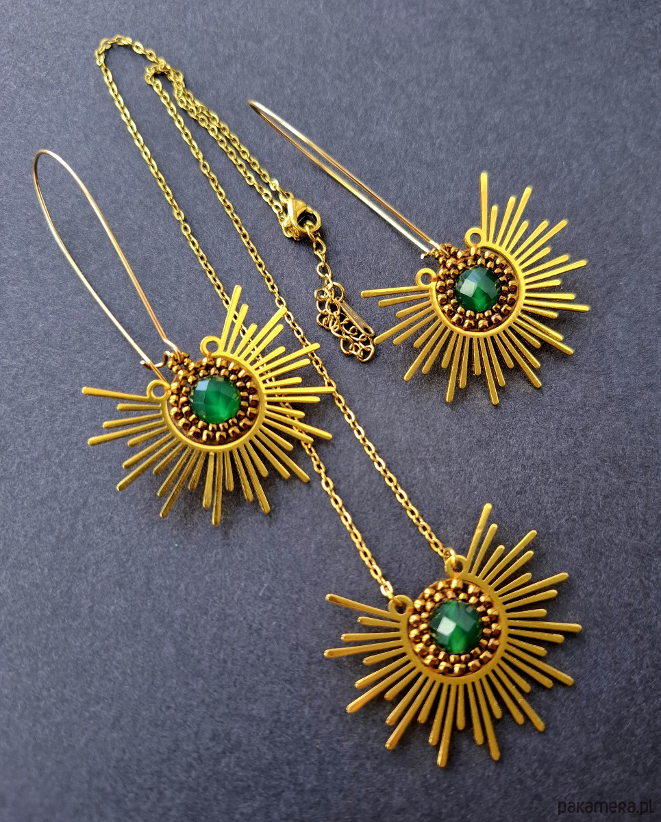 Komplet biżuterii wykonanej z połączenia stali szlachetnej, agatami brazylijskimi i koralików szklanych. Kolczyki dwustronne, podwieszone na prostych, pozłacanych i nieuczulających biglach. Naszyjnik o łańcuszku ze stali szlachetnej pozłacanej i możliwością regulacji obwodu. Wymiary kolczyków - długość wraz z zapięciem - 7,2 cm; szerokość max. 4,2 cm. Długość naszyjnika wraz z łańcuszkiem przedłużającym - 43 cm.