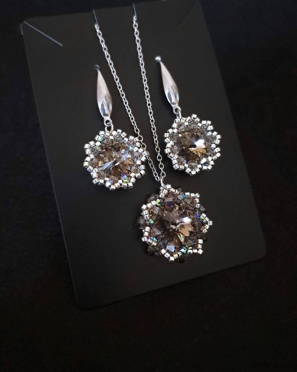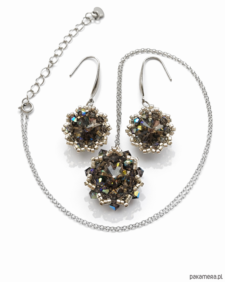 Zawieszka naszyjnika (ok. 2,7 × 2,5 cm) została wykonana z kryształu Preciosa Crystal Maxima 14 mm, otoczonego kryształkami Bicone black diamond AB i srebrnymi koralikami Miyuki. Całość zawieszona jest na stalowym łańcuszku typu ankier.