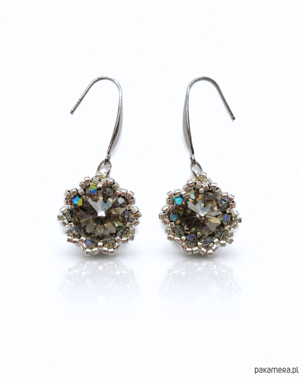 Kolczyki zdobią centralne kryształy Preciosa Rivoli Maxima 12 mm, oplecione tymi samymi srebrnymi akcentami. Długość całkowita to 4 cm.