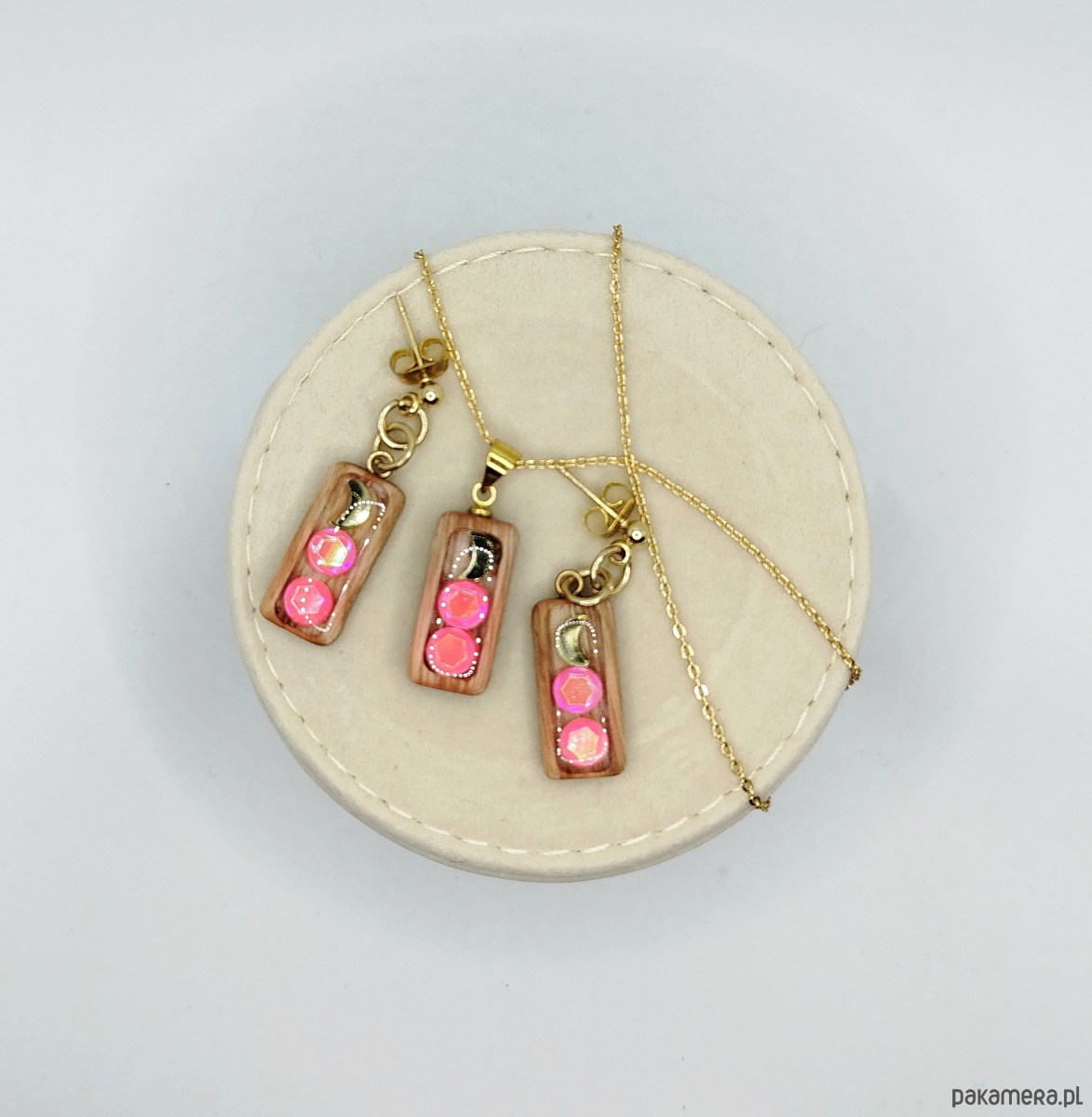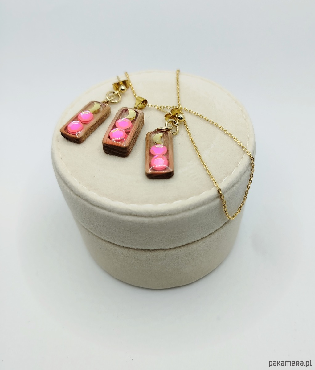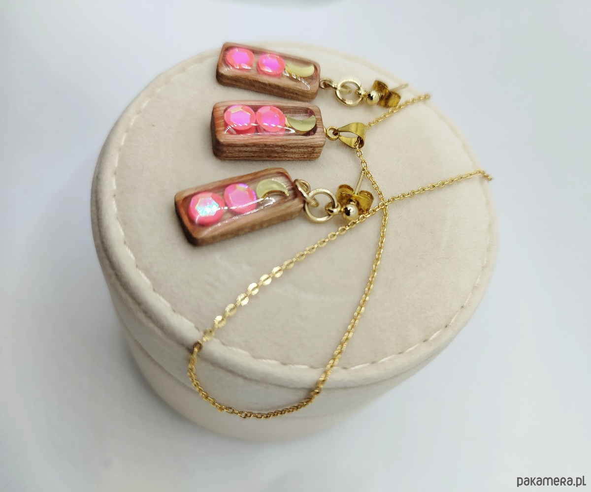 Komplet składający się z kolczyków i naszyjnika z wisiorkiem. Naturalne tworzywo drewno z ozdobnymi elementami w tym złoty księżyc i różowe koła dodają całości uroku i czarującego piękna.