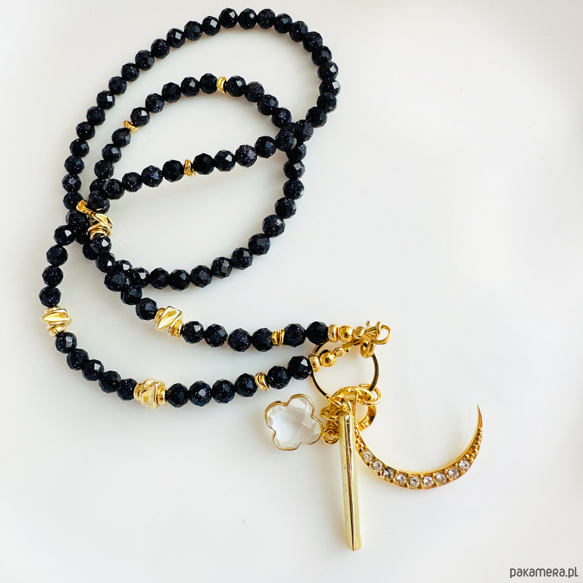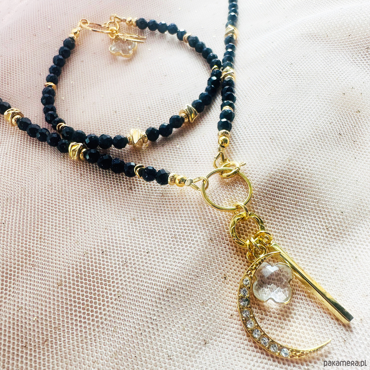 Efektowny przepiękny komplet bizuterii - naszyjnik skomponowany z ręcznie dobranych kamieni NOC KAIRU z zawieszką w kształcie księżyca oraz kryształem górskim w oprawie. Oraz bransoletka ze skrzydełkami.