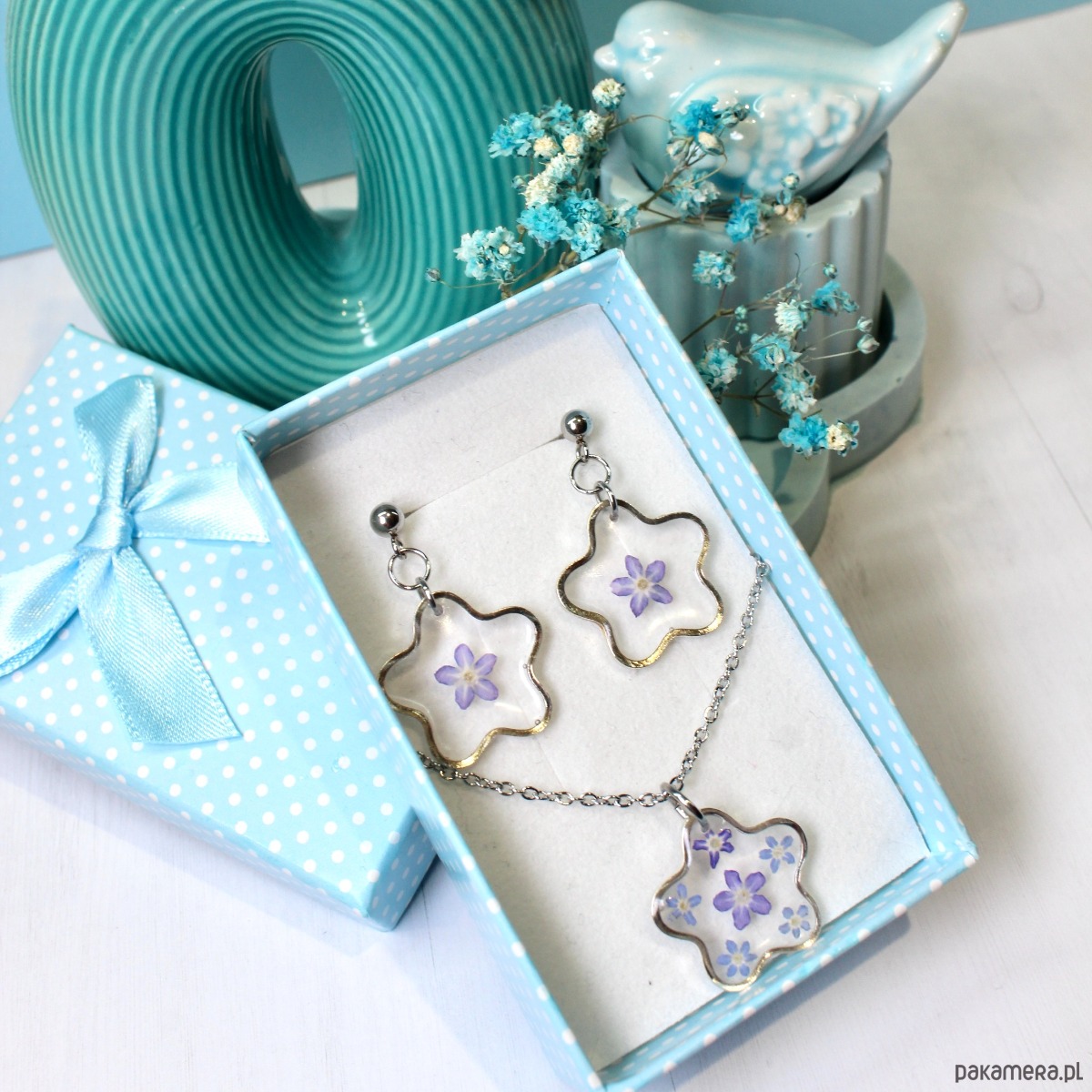 Niezapominajki zatopione w żywicy, kolczyki i naszyjnik w kształcie kwiatka.