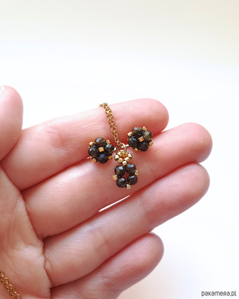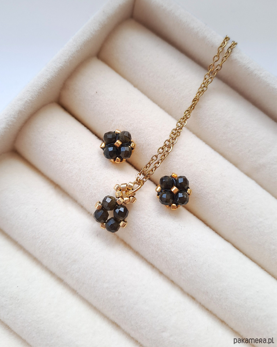 Delikatny komplet z obsydianu to połączenie minimalistycznych sztyftów i pasującego naszyjnika, które razem tworzą spójną, harmonijną całość. Biżuteria z obsydianu złocistego zachwyca głęboką czernią z subtelnym, złotym połyskiem widocznym w świetle. W połączeniu ze złotymi detalami tworzą elegancką, wyrazistą kompozycję o ponadczasowym charakterze. Minimalistyczna forma i niewielki rozmiar sprawiają, że są wygodne w noszeniu, a jednocześnie przyciągają spojrzenia swoją tajemniczą głębią.