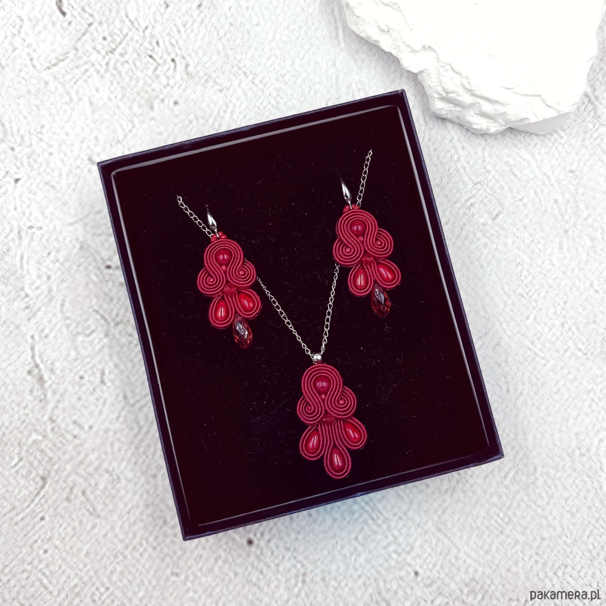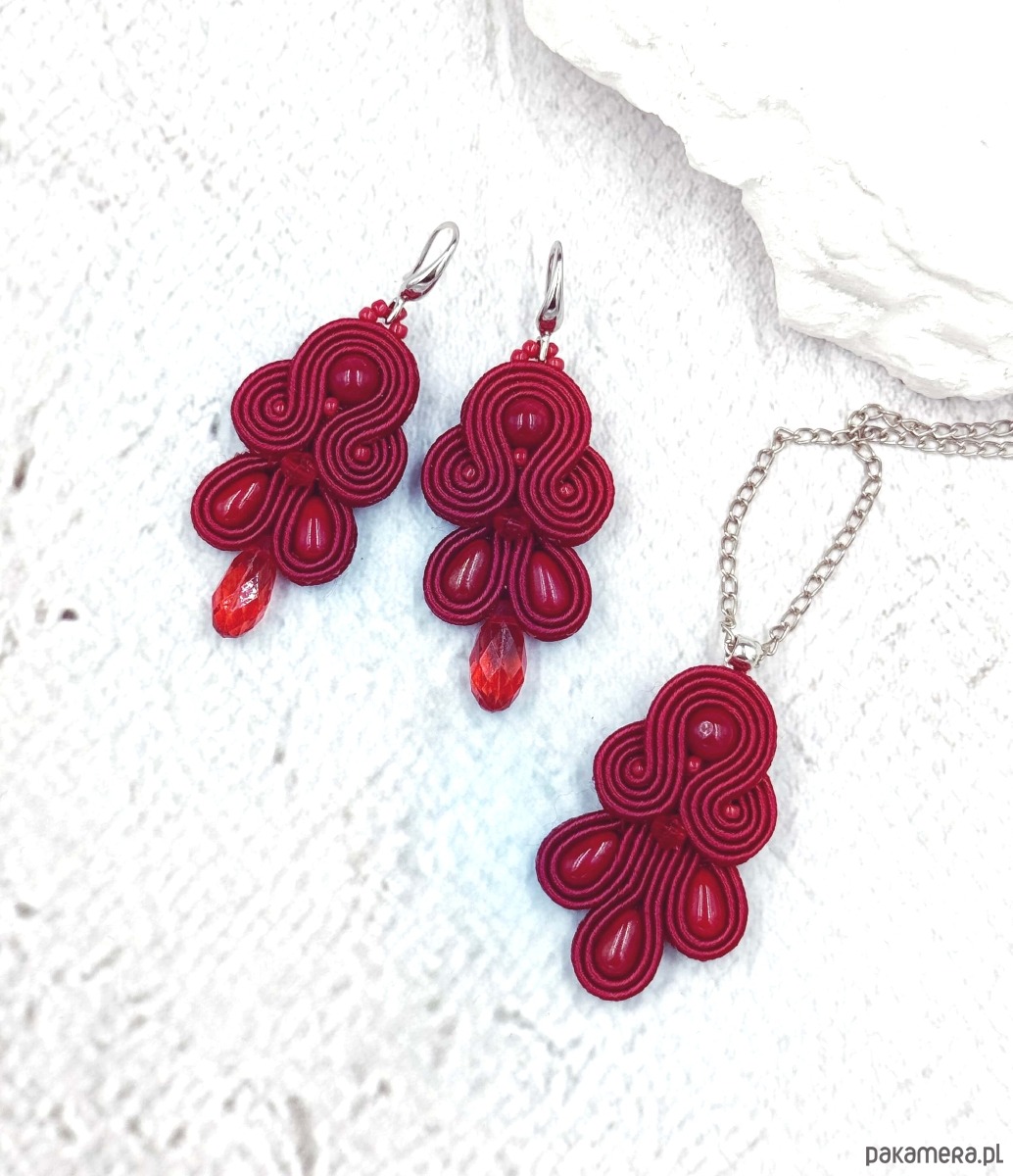Ręcznie wykonany komplet biżuterii sutasz w ciemnej czerwieni, który podkreśli Twoją wyjątkowość. Kolczyki i naszyjnik ozdobione czerwonymi koralami to eleganckie połączenie klasyki i nowoczesności. Idealny na specjalne okazje lub jako wyjątkowy prezent. Dodaj blasku swojej stylizacji dzięki temu unikalnemu zestawowi!