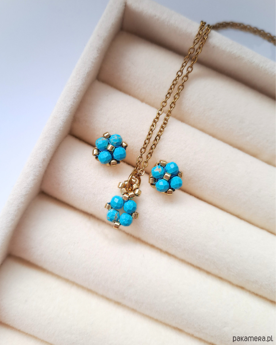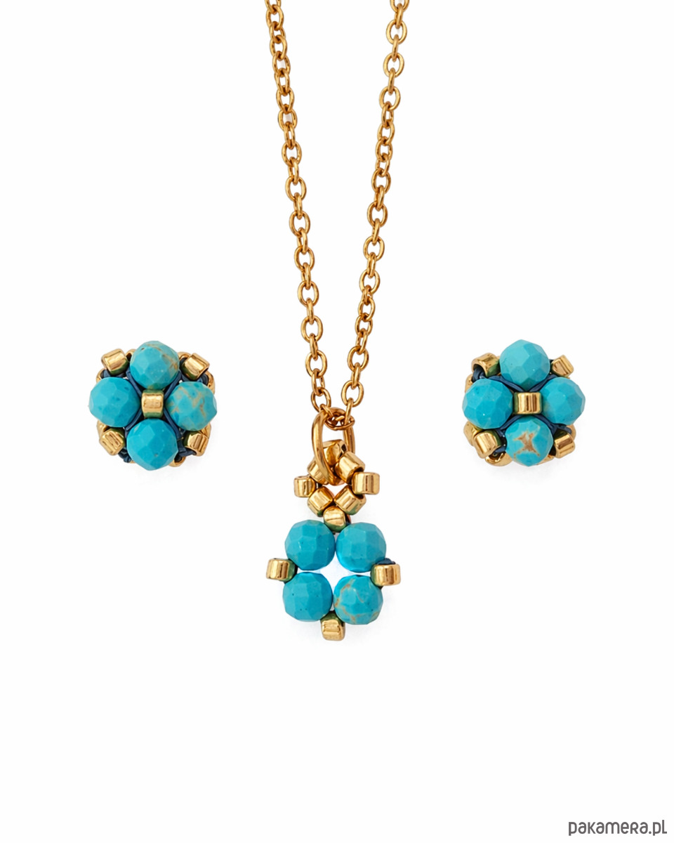 Delikatny komplet z turkusu to połączenie minimalistycznych sztyftów i pasującego naszyjnika, które zachwycają intensywnym, morskim odcieniem przełamanym naturalnym rysunkiem kamienia. Złota oprawa z koralików Miyuki dodaje im ciepła i elegancji, pięknie podkreślając nasyconą barwę turkusu. To połączenie tworzy wyrazistą, a jednocześnie harmonijną kompozycję, która rozświetla twarz i dodaje stylizacji świeżości.