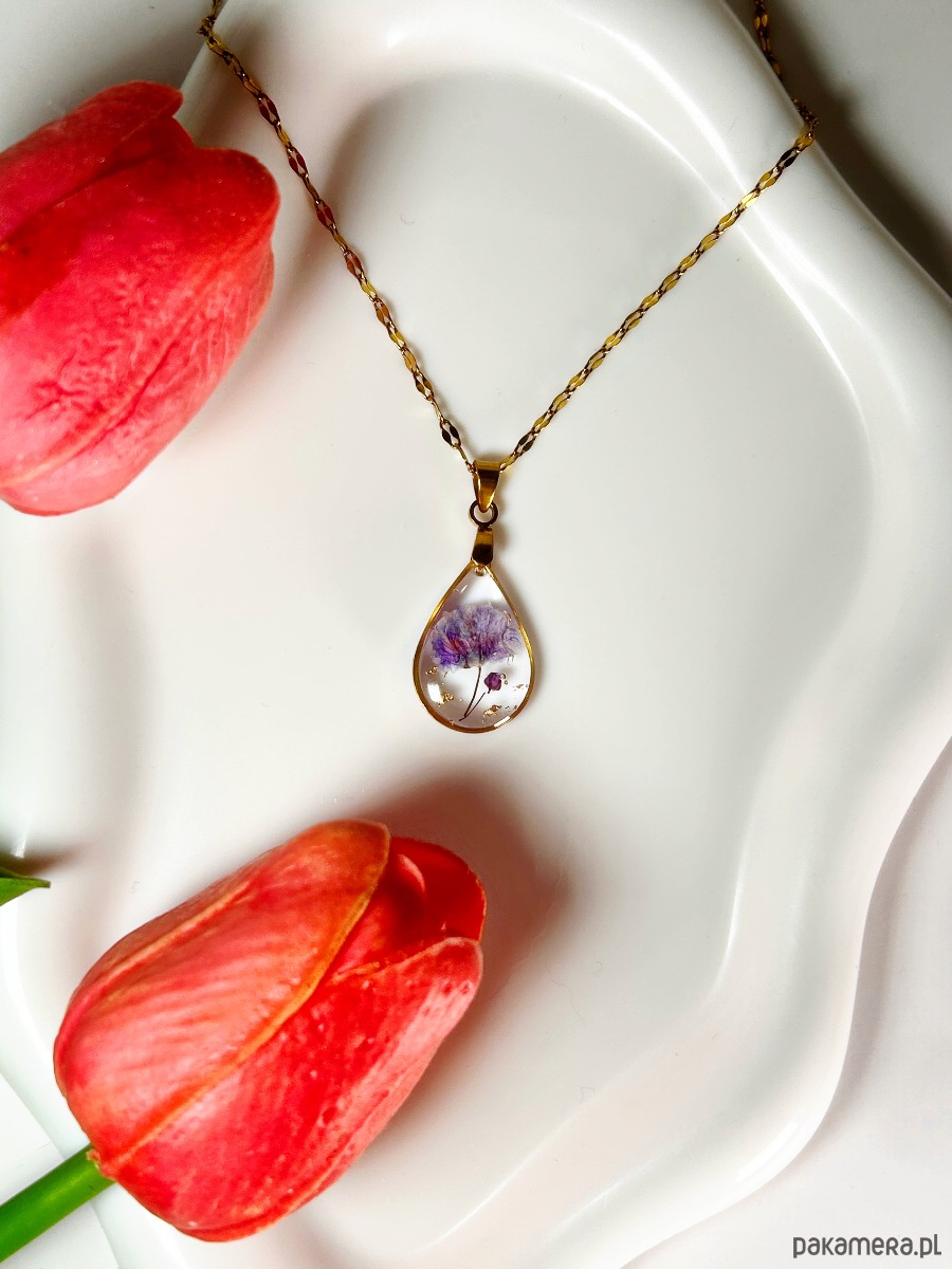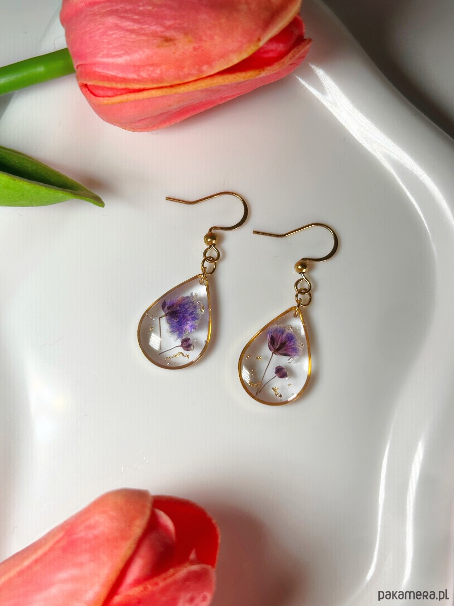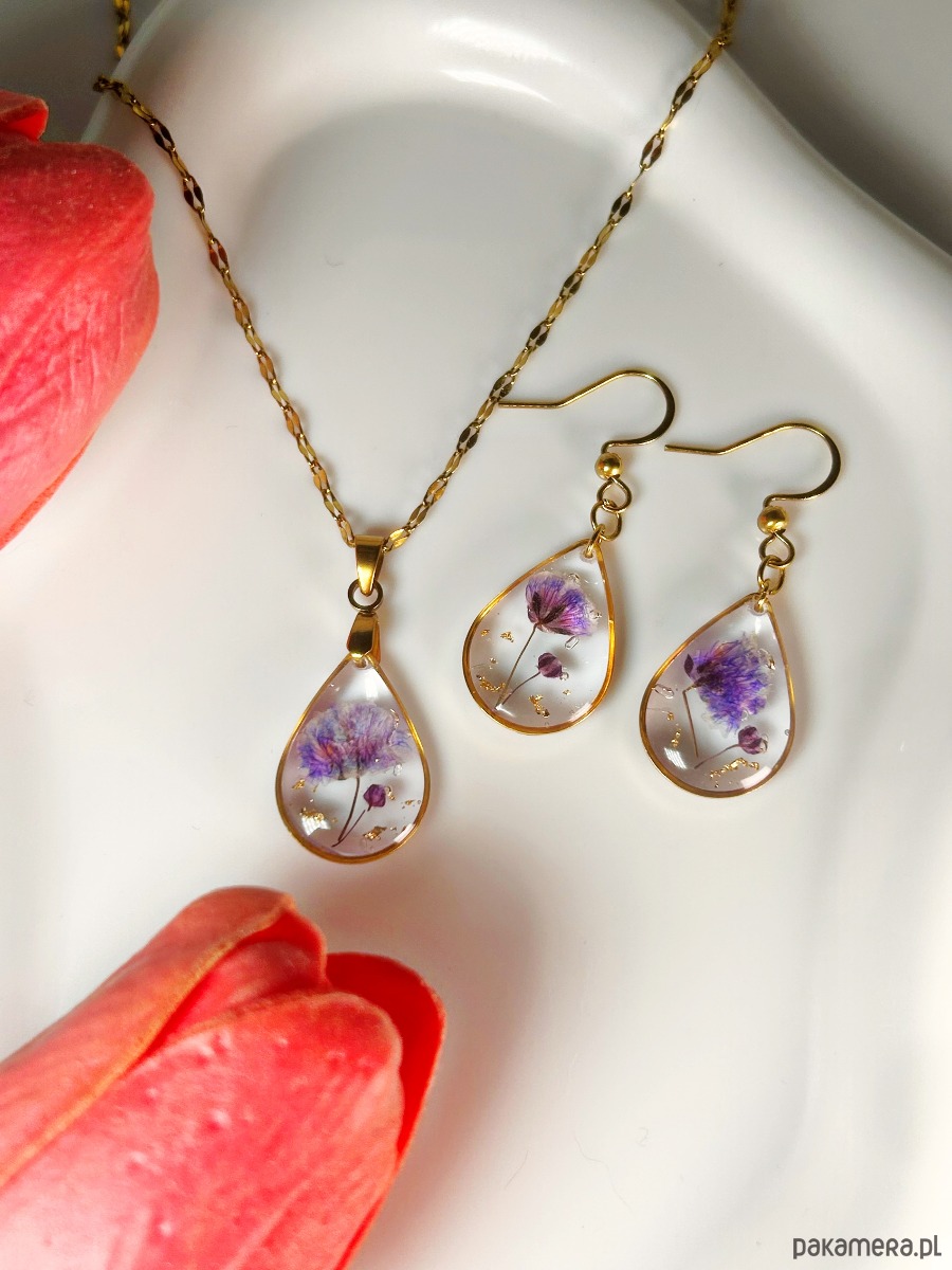 Subtelny, ręcznie wykonany komplet biżuterii, w którym prawdziwe, suszone kwiaty zostały na zawsze zatopione w transparentnej żywicy. Delikatne fioletowe akcenty i drobinki złota tworzą elegancką, harmonijną kompozycję, która podkreśla naturalne piękno i lekkość formy.
