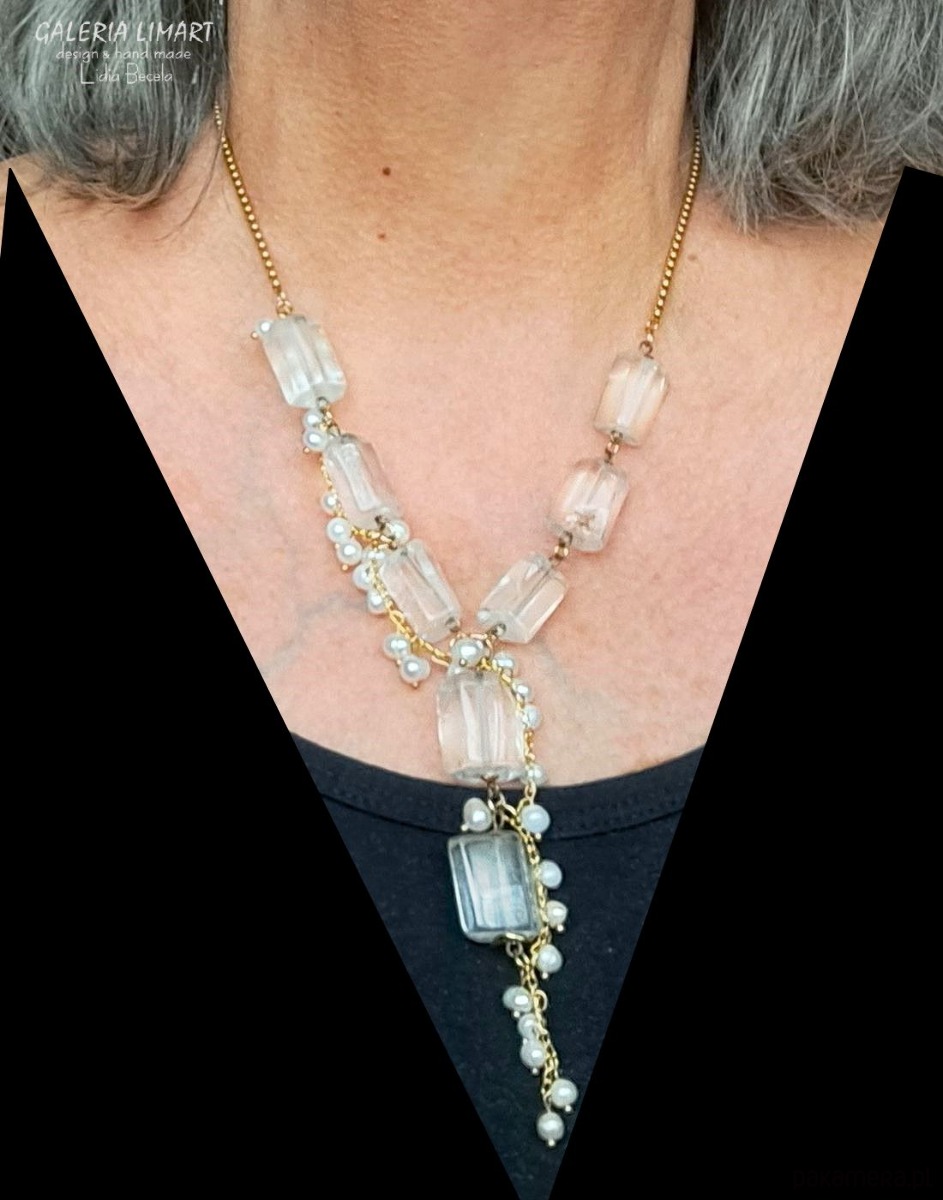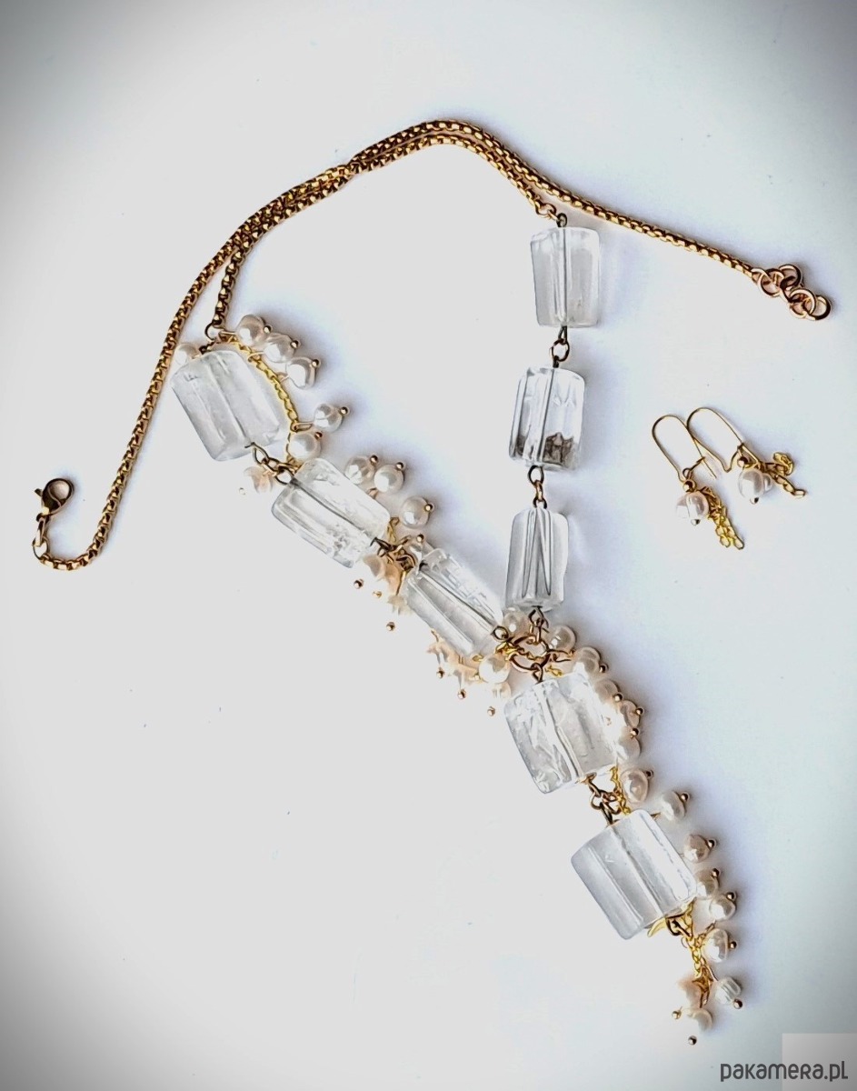 Moja unikatowa kompozycja tego kompletu biżuterii, w swym pierwotnym założeniu była jako biżuteria ślubna. Ale tego typu biżuteria sprawdza się również doskonale na co dzień dzięki stylizacji utrzymanej w duchu bardzo modnego stylu Boho (bohemy, cyganerii artystycznej, new hippie style). Naszyjnik i delikatne kolczyki zostały stworzone z mixu surowego prawdziwego kryształu górskiego, prawdziwych pereł i elementów ozdobnych ze stali szlachetnej w kolorze złotym. To atrakcyjny komplet dedykowany osobie niekonwencjonalnej, kochającej oryginalność, unikatowość i nieograniczonej żadnym dress-codem. Na pewno zwróci uwagę swoją niebanalnością i spektakularnością, to taki biżuteryjny rarytas :).