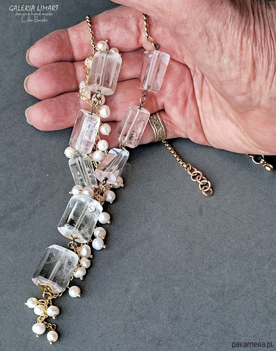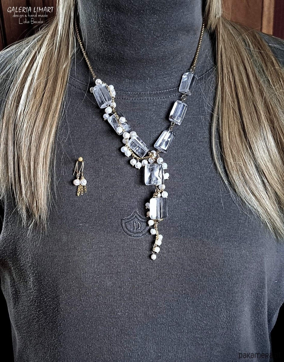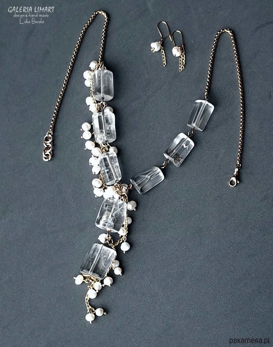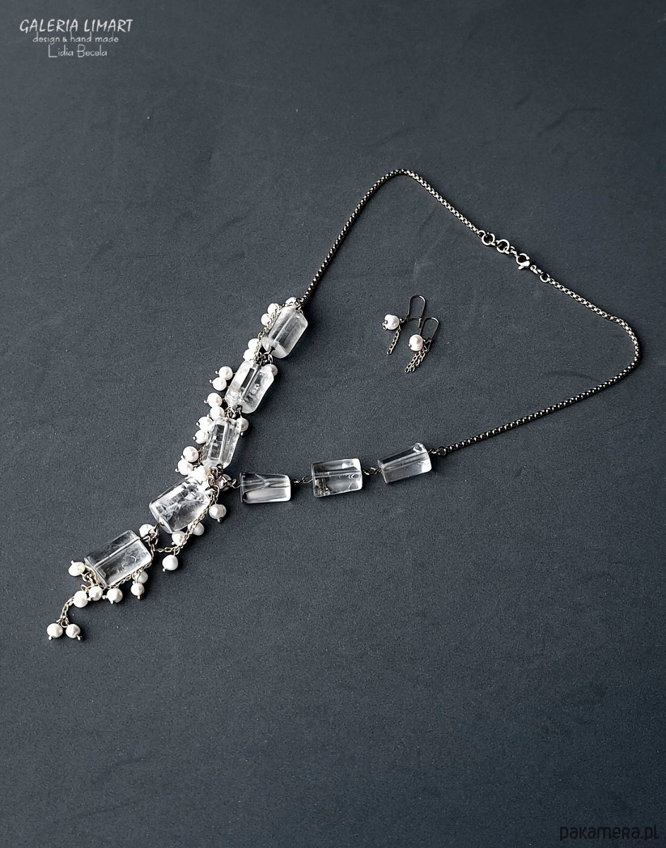 Komplet biżuterii z kryształu górskiego i pereł unikat handmade PREZENT lux