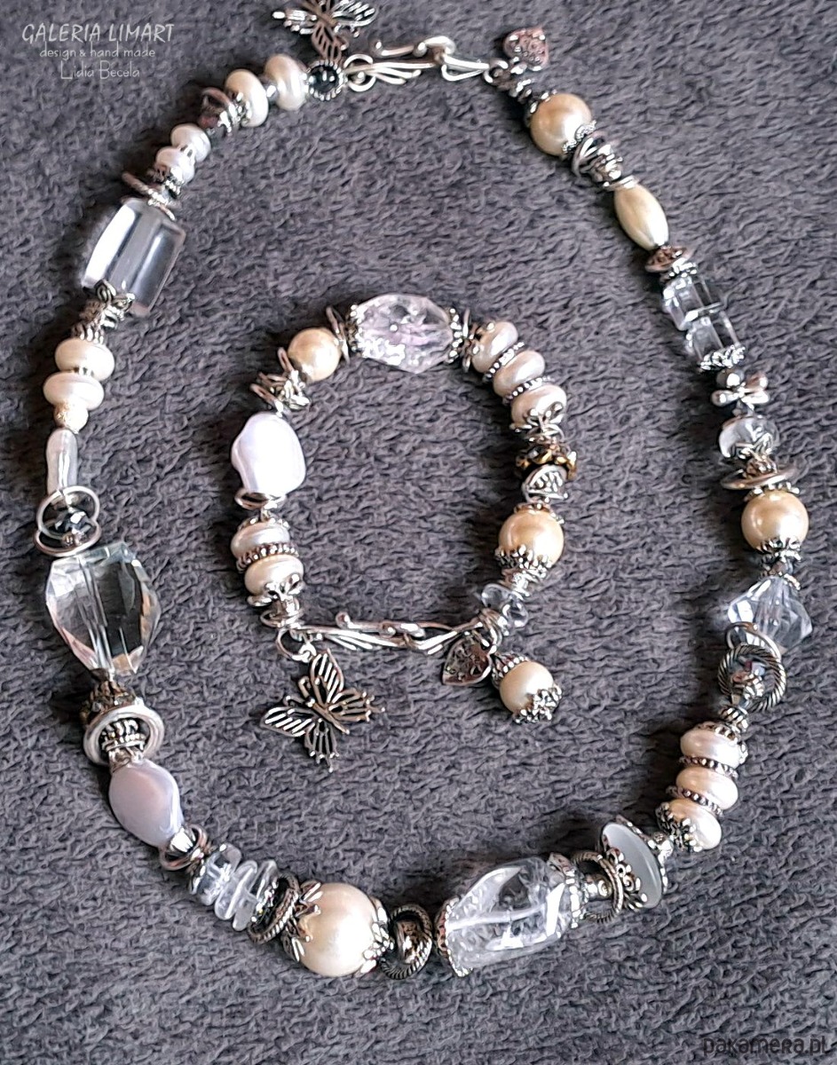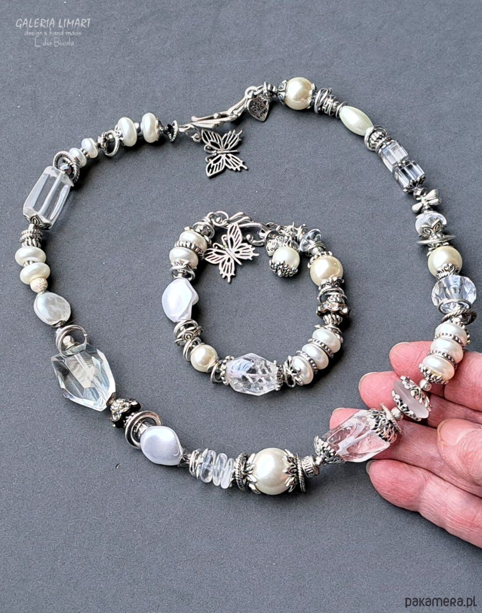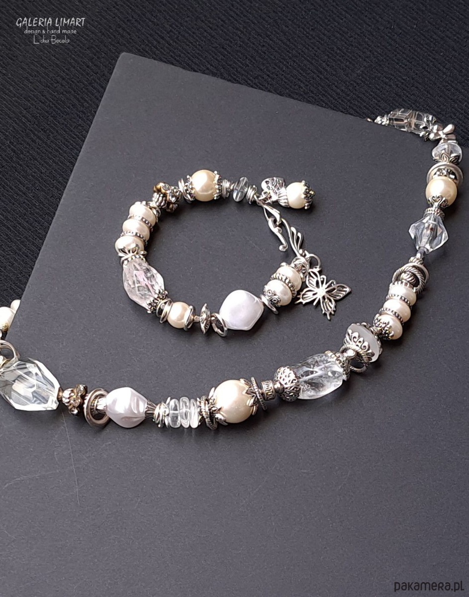 Naszyjnik i bransoletka z kryształu górskiego i pereł unikat ręcznie robiony