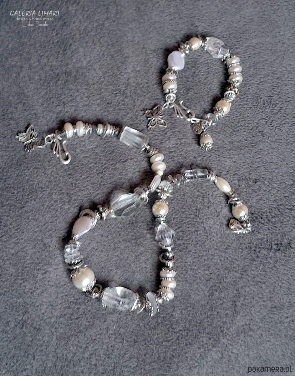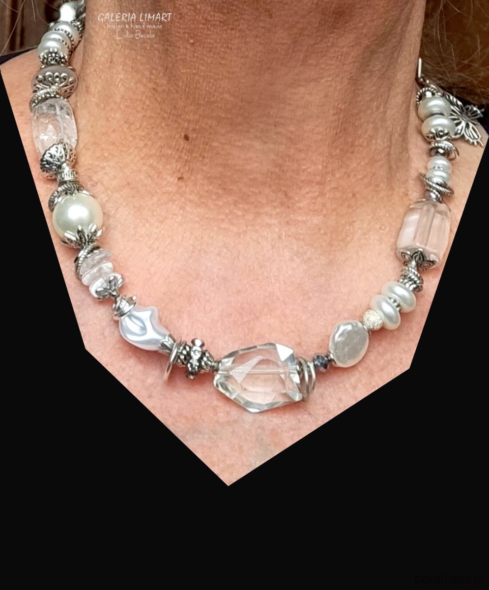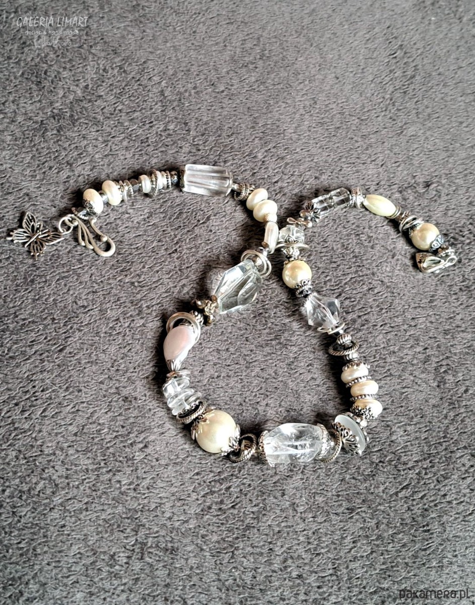 Naszyjnik i bransoletka z kryształu górskiego i pereł unikat ręcznie robiony