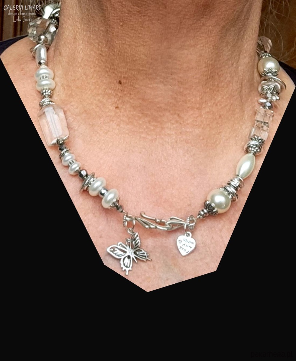 Moja unikatowa kompozycja tego kompletu biżuterii, w swym pierwotnym założeniu była jako biżuteria ślubna. Ale tego typu biżuteria sprawdza się również doskonale na co dzień dzięki stylizacji utrzymanej w duchu bardzo modnego stylu Boho (bohemy, cyganerii artystycznej, new hippie style). Naszyjnik i bransoletka zostały stworzone z mixu surowego prawdziwego kryształu górskiego, prawdziwych i szklanych pereł i elementów ozdobnych ze stali w kolorze srebrnym. To atrakcyjny komplet dedykowany osobie niekonwencjonalnej, kochającej oryginalność, unikatowość i nieograniczonej żadnym dress-codem. Na pewno zwróci uwagę swoją niebanalnością i spektakularnością, to taki biżuteryjny rarytas :).