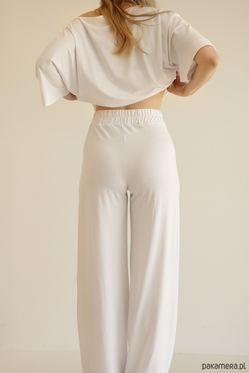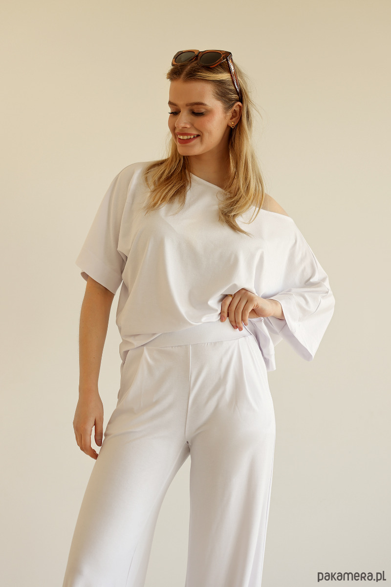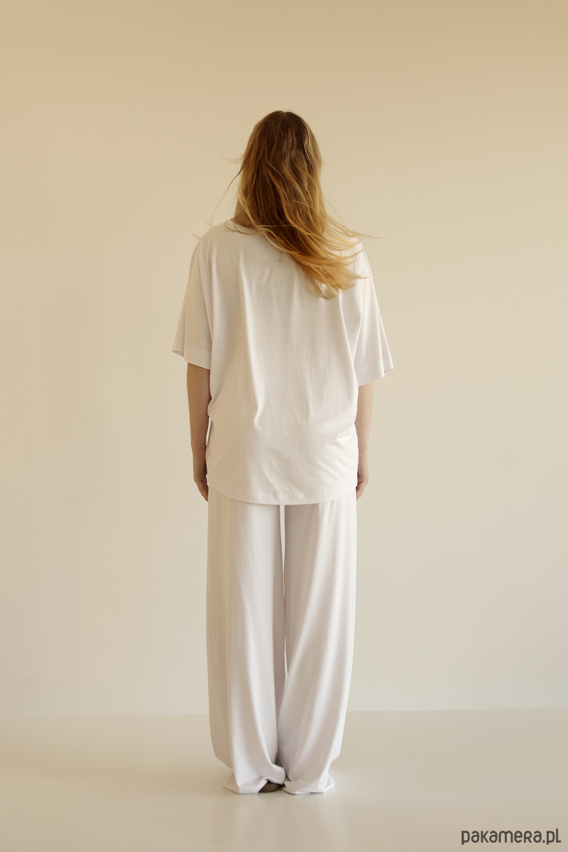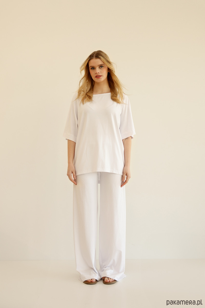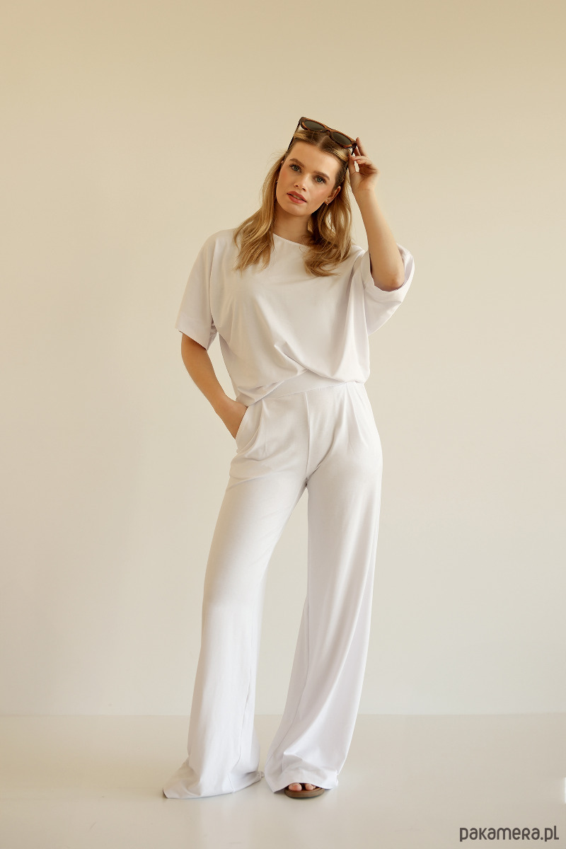 Składa się z modnych spodni o szerokich nogawkach oraz luźnej bluzki – idealnie dopełniających się elementów garderoby. Całość została uszyta z miękkiej, przyjemnej w dotyku, przewiewnej dzianiny wiskozowej, co zapewnia wygodę noszenia przez cały dzień.