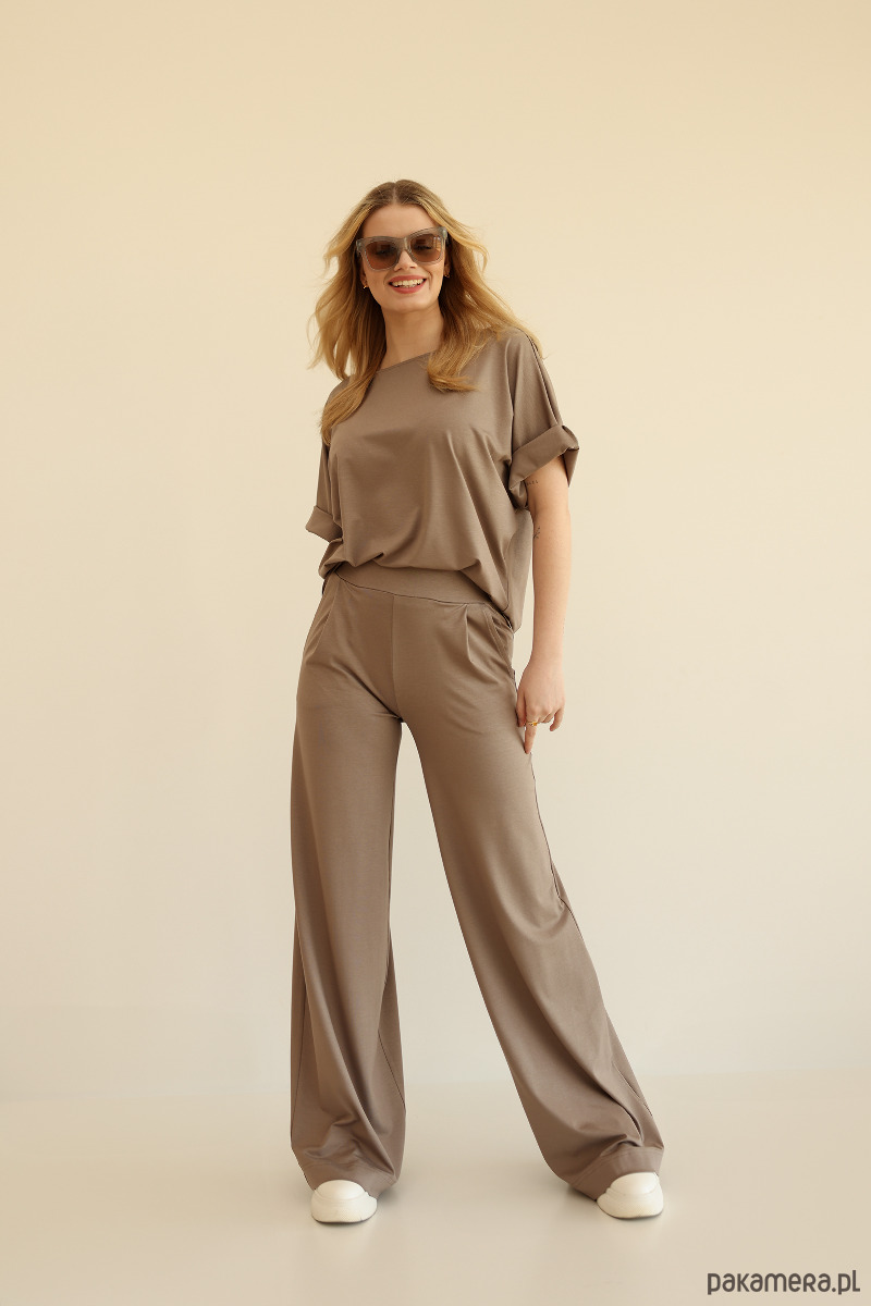 Składa się z modnych spodni o szerokich nogawkach oraz luźnej bluzki – idealnie dopełniających się elementów garderoby. Całość została uszyta z miękkiej, przyjemnej w dotyku, przewiewnej dzianiny wiskozowej, co zapewnia wygodę noszenia przez cały dzień.