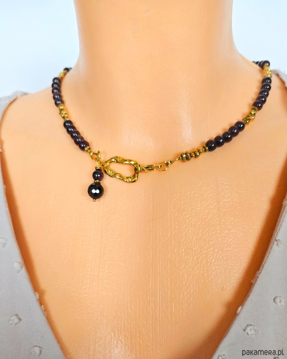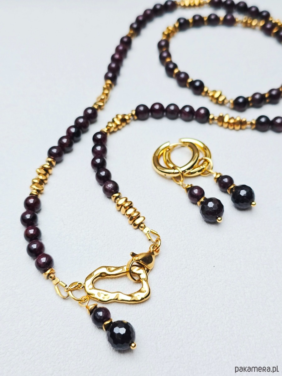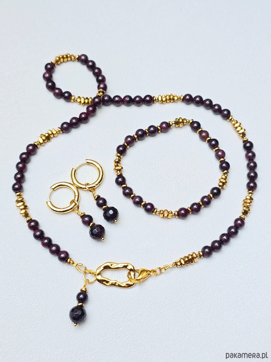 Piękny 3 elementowy komplet z kamieni granatu i złoconego hematytu.