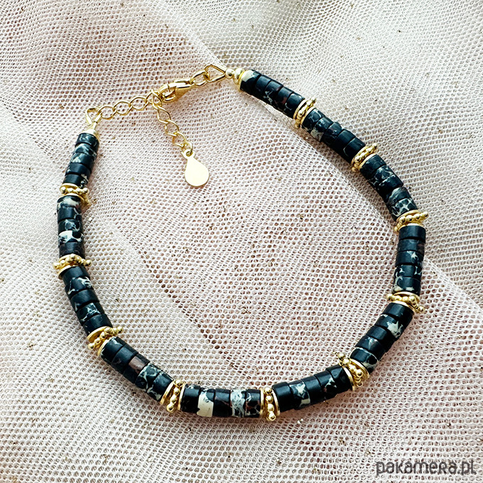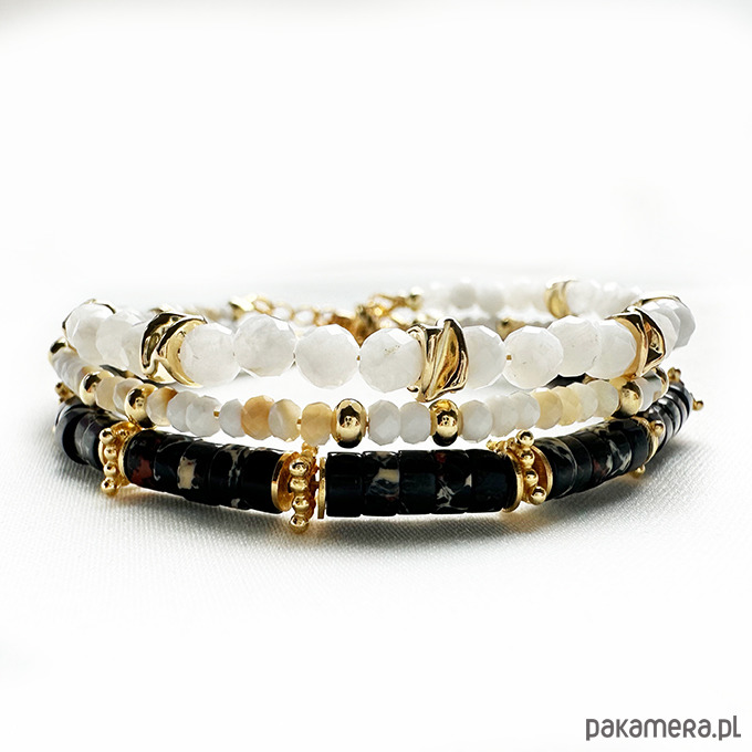 Wyjątkowy, ręcznie wykonany komplet trzech bransoletek w eleganckiej kolorystyce czerni, bieli, kremu i złota. Zostały starannie skomponowane z drobnych koralików z masy perłowej, kamienia księżycowego oraz jaspisu cesarskiego, co nadaje całości subtelnego blasku i klasy.
