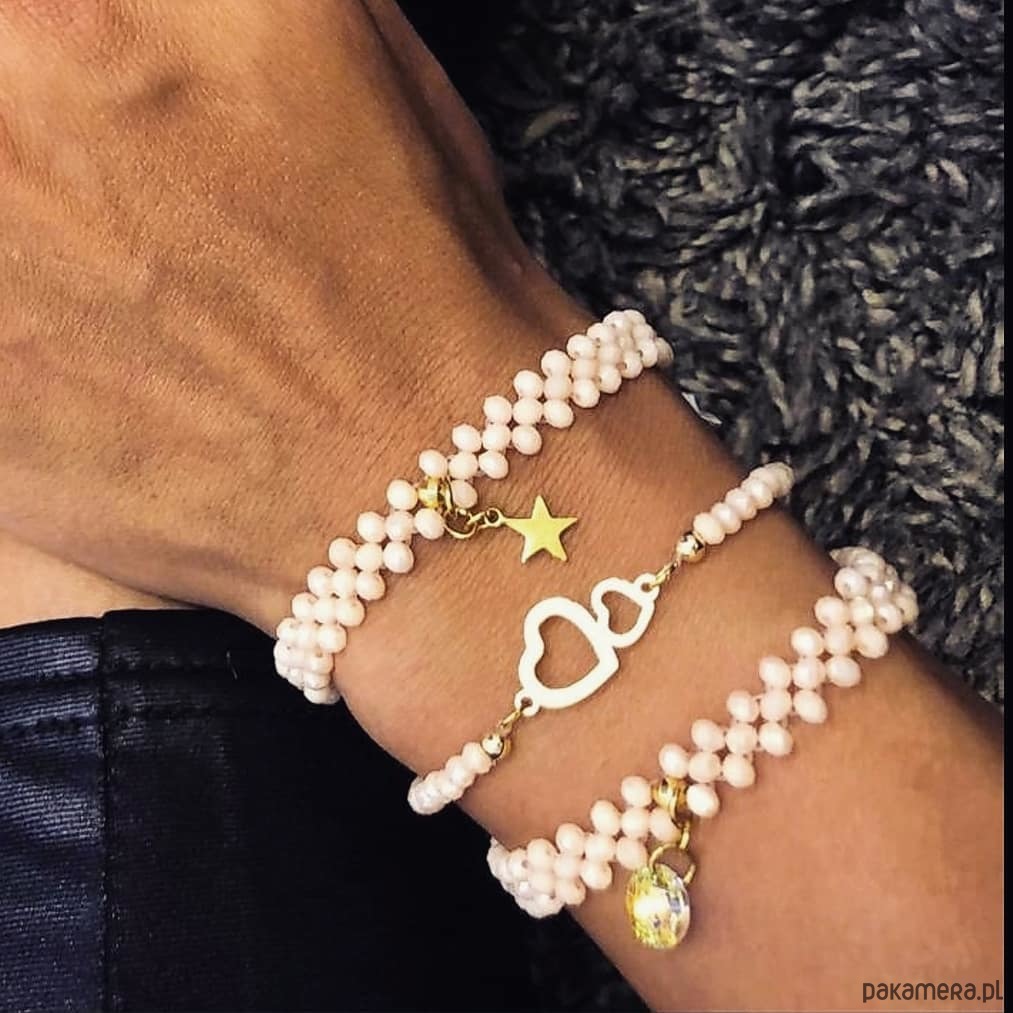 Komplet 3 bransoletek wykonanych ze szkła kryształowego w kolorze kremowym, w połączeniu z elementami ze stali szlachetnej oraz kryształu Swarovskiego. Komplet składa się z 2 bransoletek potrójnych: z okrągłą zawieszką z kryształu Swarovskiego oraz zawieszką gwiazdką ze stali szlachetnej, a także 1 pojedynczej bransoletki z łącznikiem o kształcie serduszek ze stali szlachetnej. Bransoletki nawinięte są na elastyczną, trwałą gumkę silikonową.