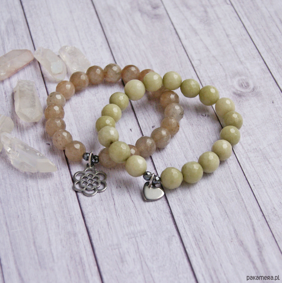 TUTAJ: zjawiskowy zestaw 2 bransoletek na solidnej lince elastycznej wykonane z fasetowanych kul jadeitu (10mm); zawieszki ze stali szlachetnej (nie uczula, kolor nie ściera się) umieszczona pomiędzy kuleczkami fasetowanego jadeitu.