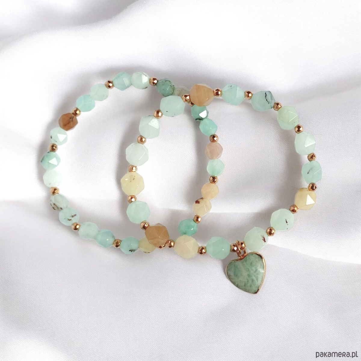 Bransoletki na solidnej gumce jubilerskiej - została wykonana z wielobarwnego jadeitu amazonitowego o ciekawym szlifie (ok 8 i 6mm) ,przekładek ze złotego hematytu oraz serca z amazonitu w metalowej oprawie.