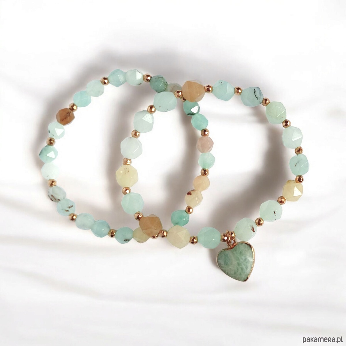 Bransoletki na solidnej gumce jubilerskiej - została wykonana z wielobarwnego jadeitu amazonitowego o ciekawym szlifie (ok 8 i 6mm) ,przekładek ze złotego hematytu oraz serca z amazonitu w metalowej oprawie.