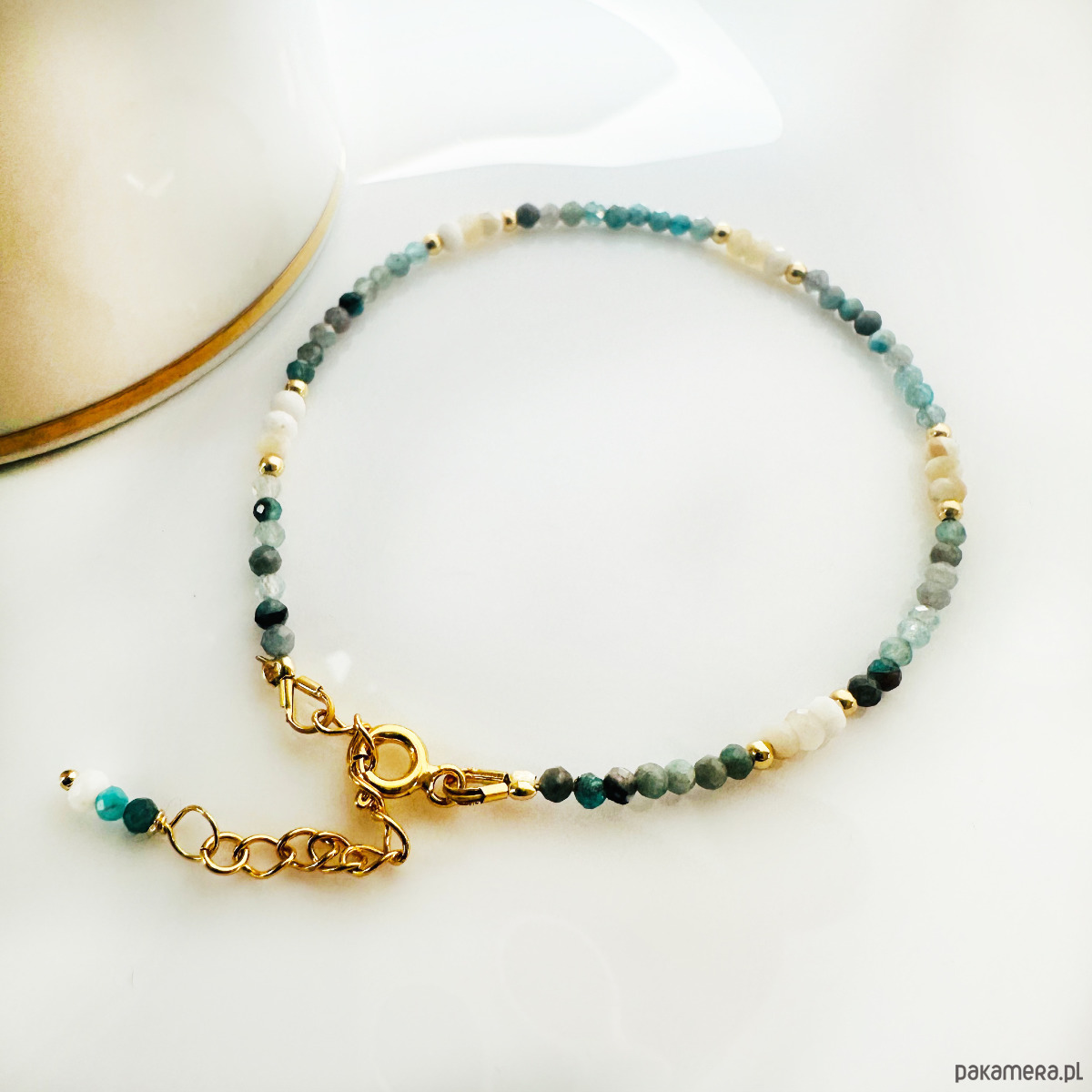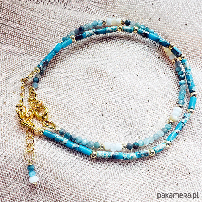 Komplet bransoletek z Jaspisu cesarskiego oraz apatytu w pięknych odcieniach turkusu i błękitu. Wykonana ręcznie z kamieni i srebrnych złoconych 24 k złotem elementów.