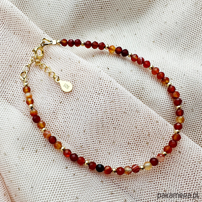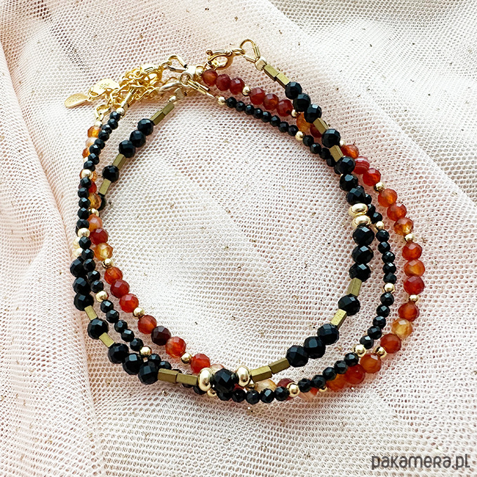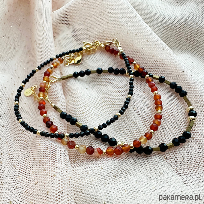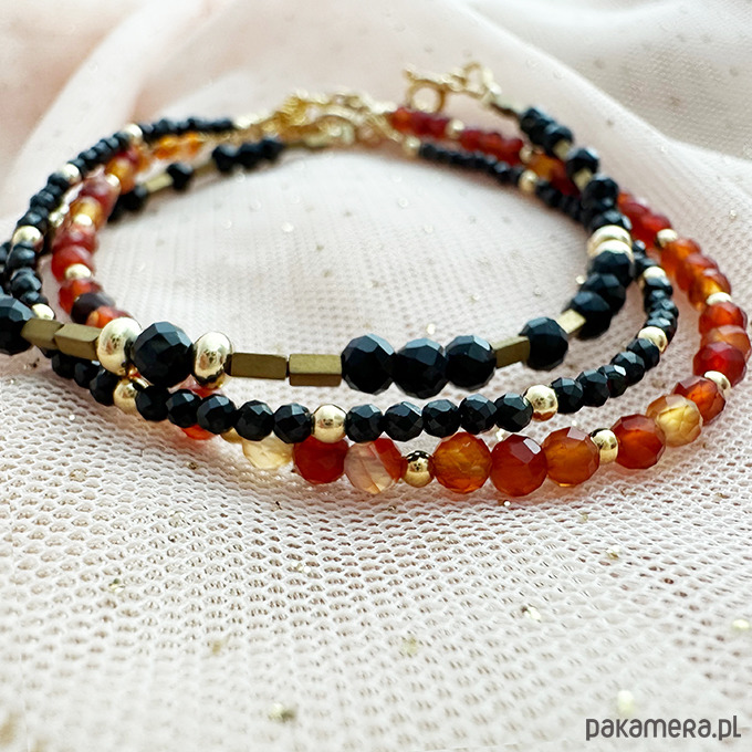 Elegancki, efektowny komplet bransoletek w kolorystyce czerwono czarno złotej. Skomponowane z delikatnych koralików z onyksu , hematytu i agatu. , .Bransoletki można nosić oddzielnie lub osobno w dowolnych zestawieniach.