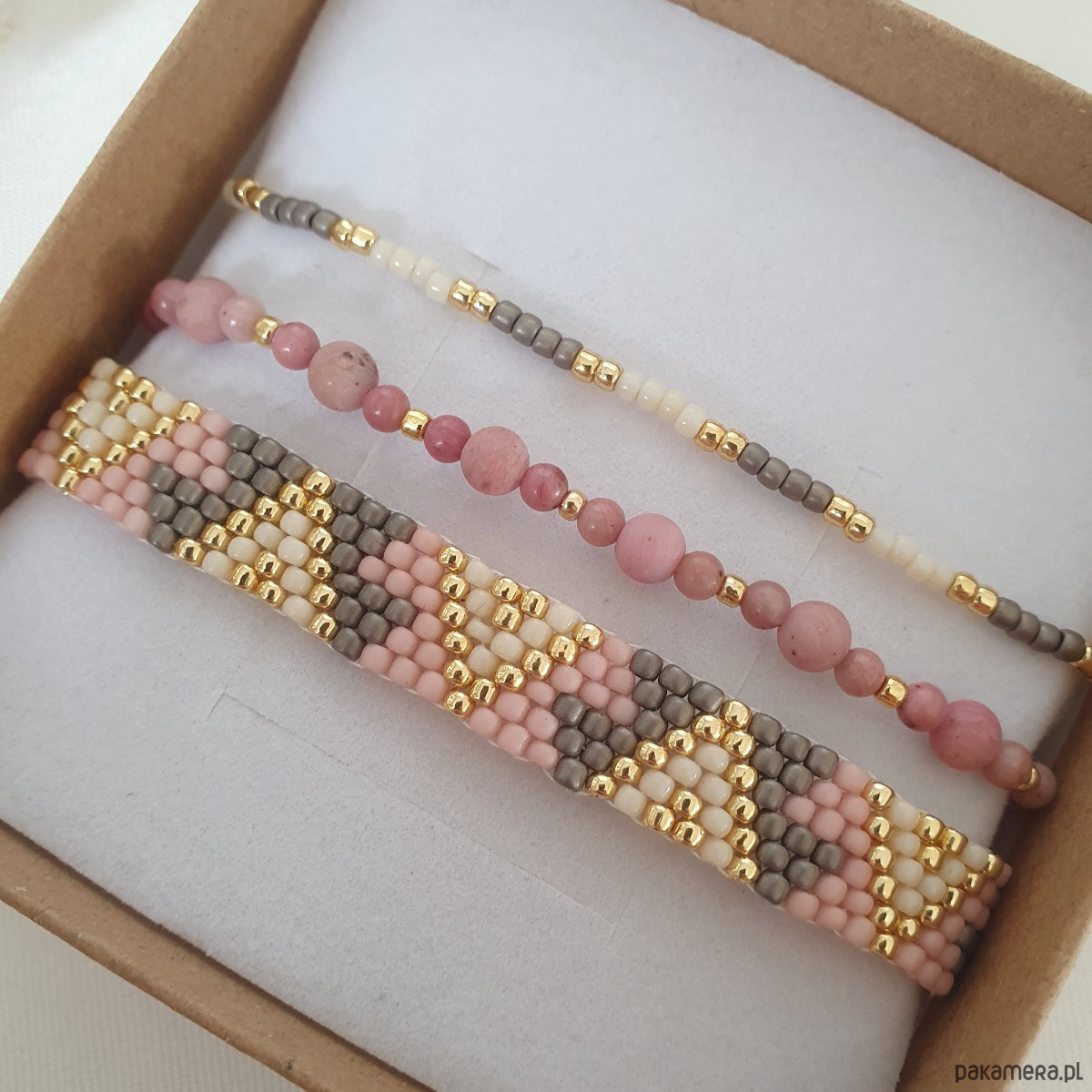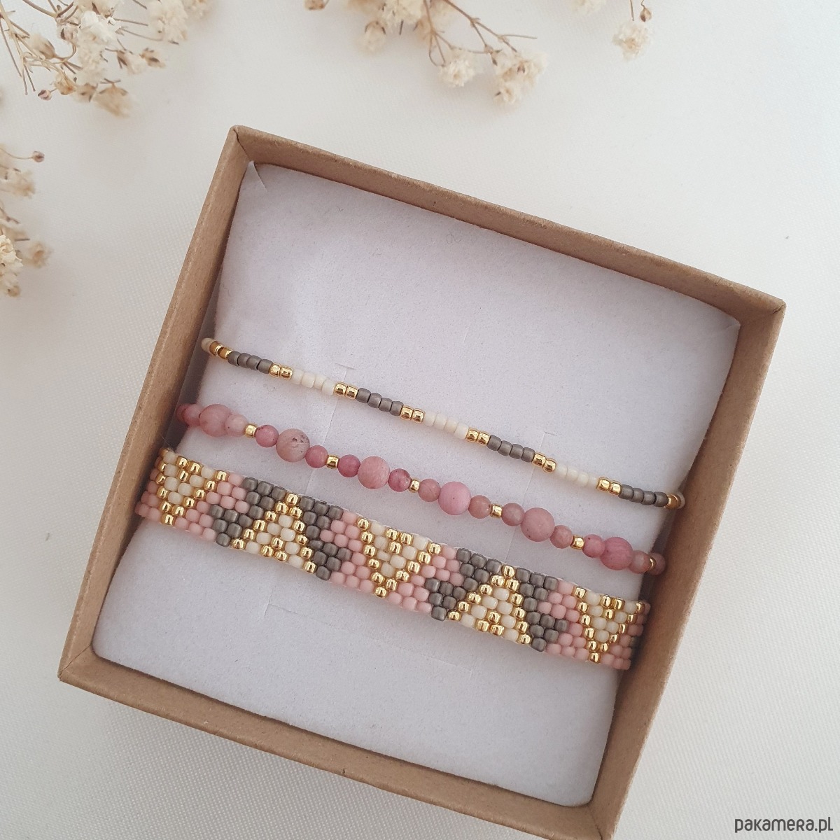 Zestaw trzech wyjątkowych bransoletek handmade, wykonanych na wytrzymałej nici jubilerskiej z regulowanym zapięciem makrama. Delikatne połączenie szkła japońskiego i kamieni naturalnych w odcieniach różu, kremu i szarości tworzy harmonijną, kobiecą kompozycję.