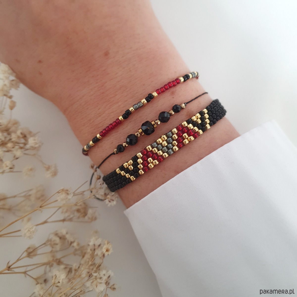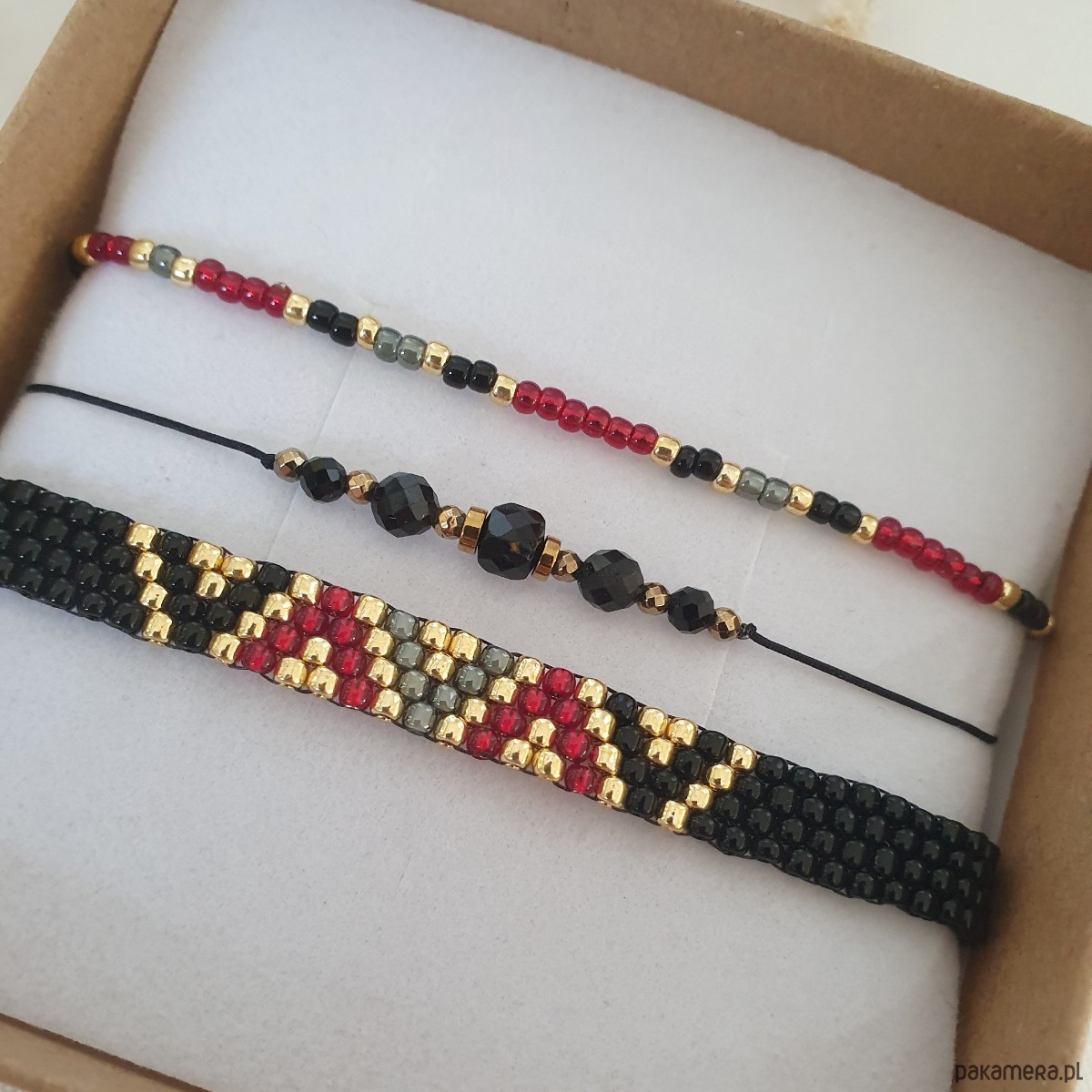 Zestaw trzech bransoletek wykonanych na wytrzymałej nici jubilerskiej z regulowanym zapięciem: