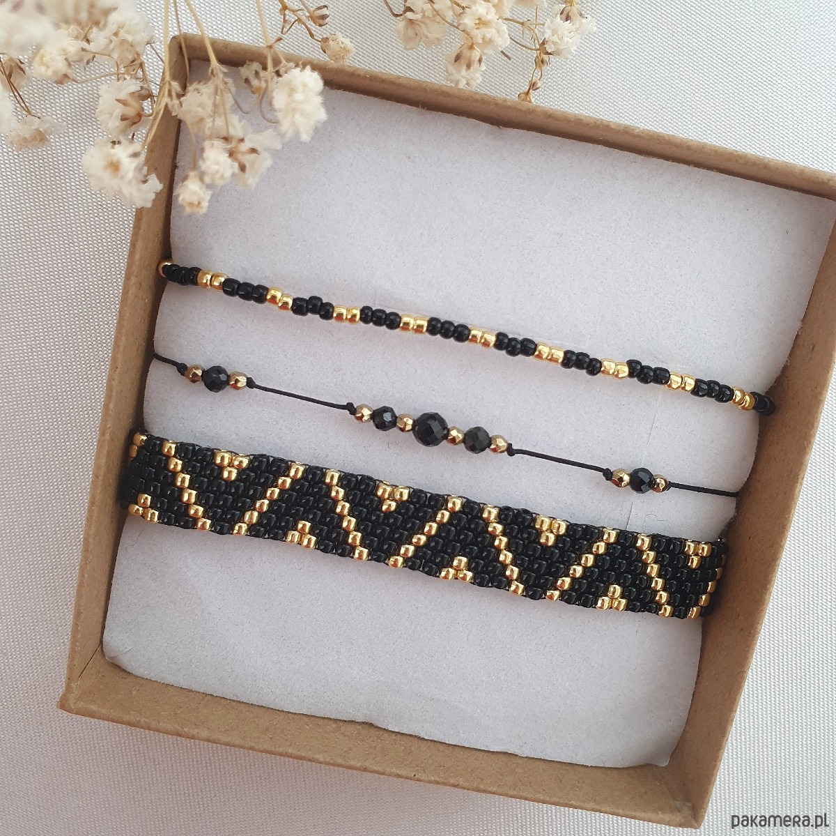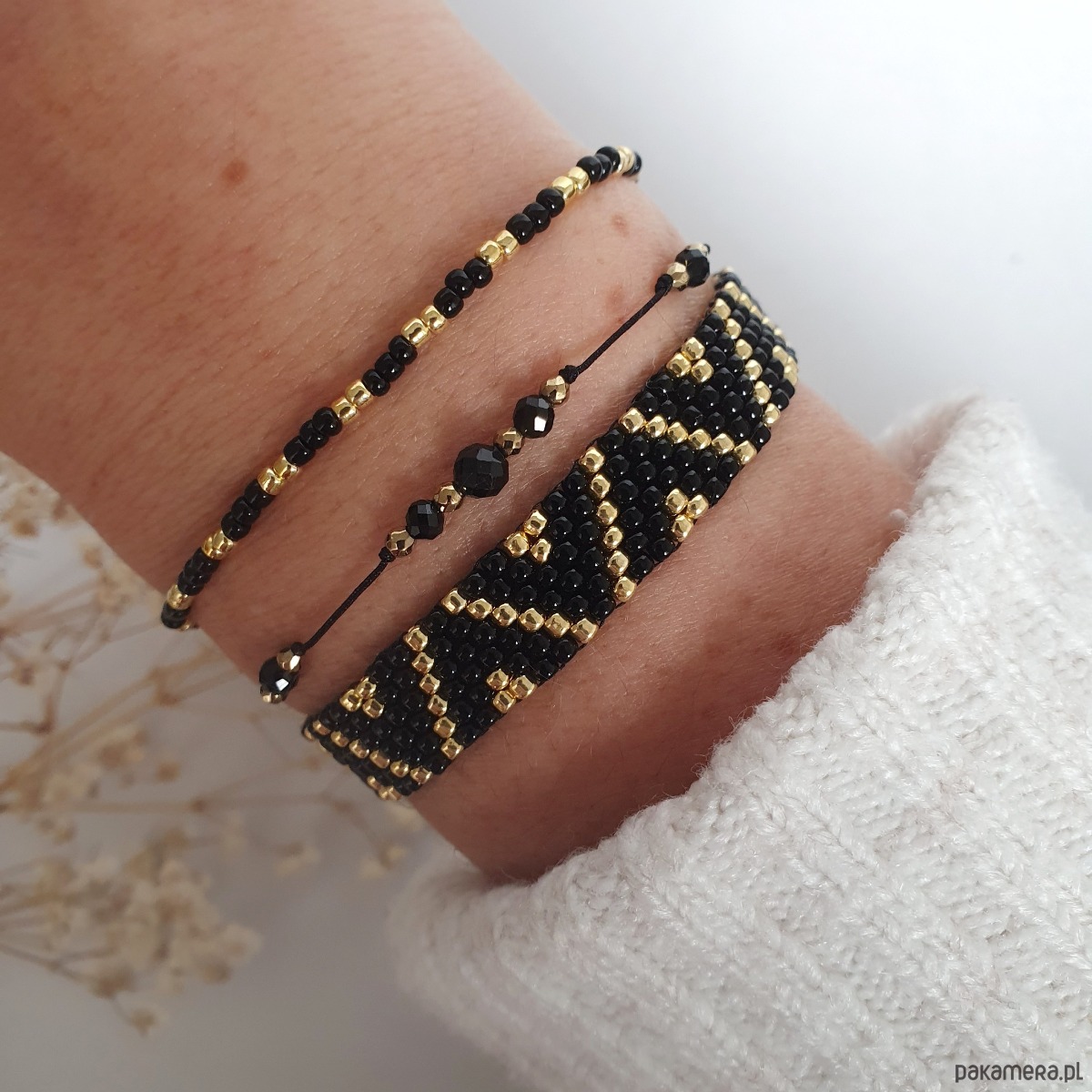 Zestaw trzech bransoletek z kamieni naturalnych i szkła japońskiego – czerń i złoto