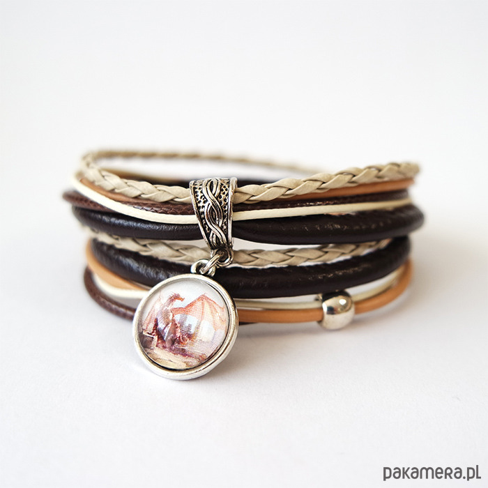 Bransoletka wykonana jest z rzemieni z ekoskóry, skóry oraz sznureczka.