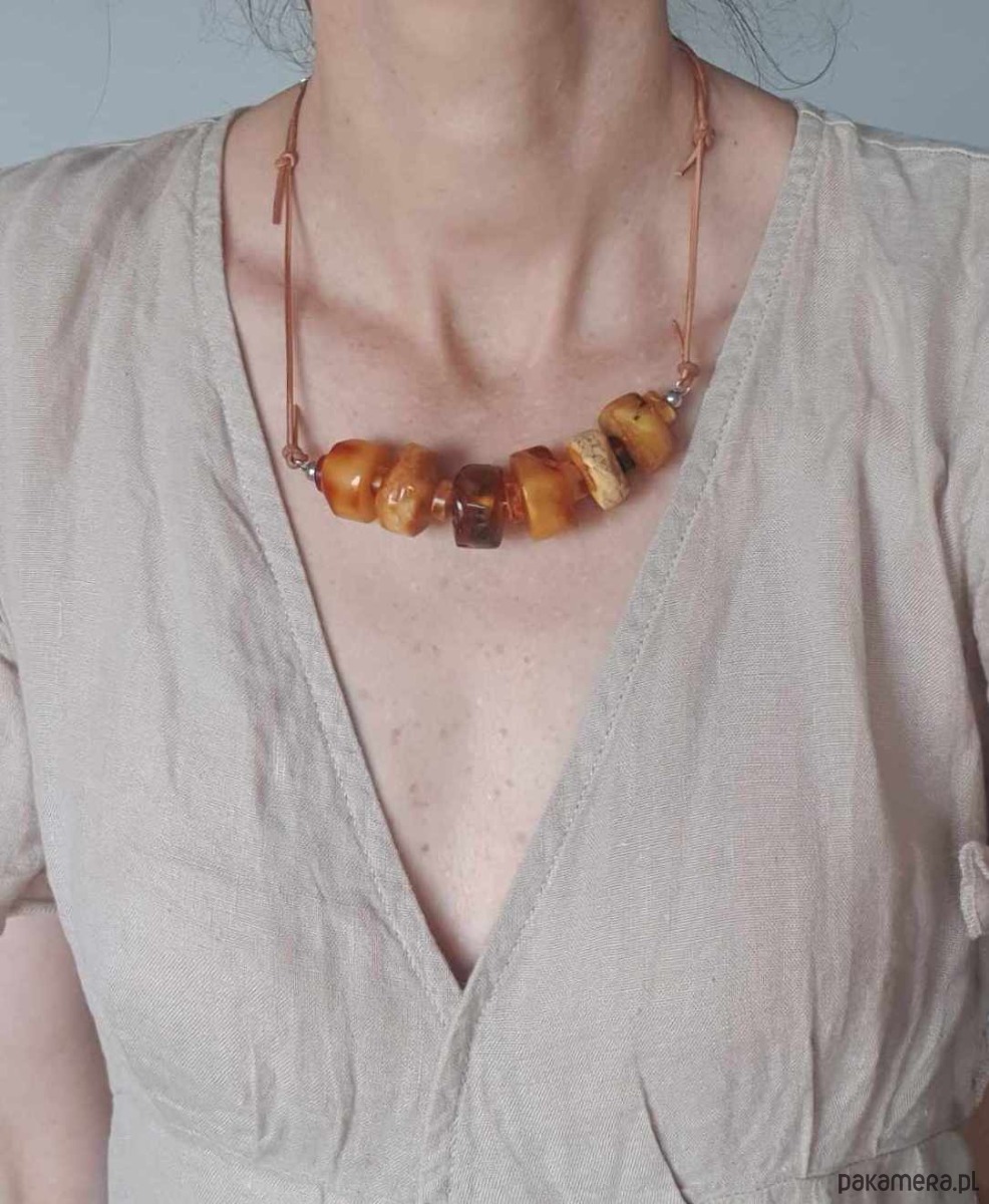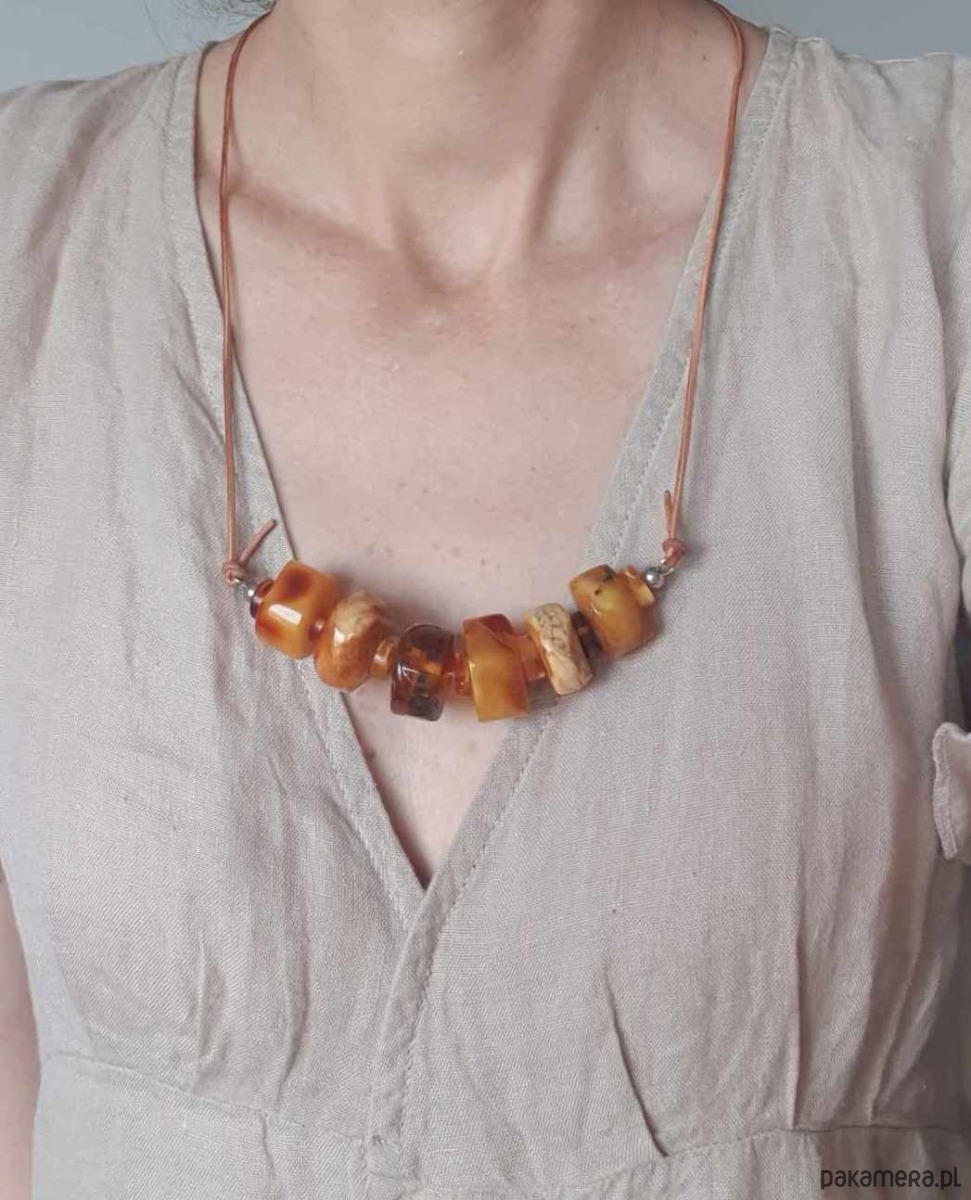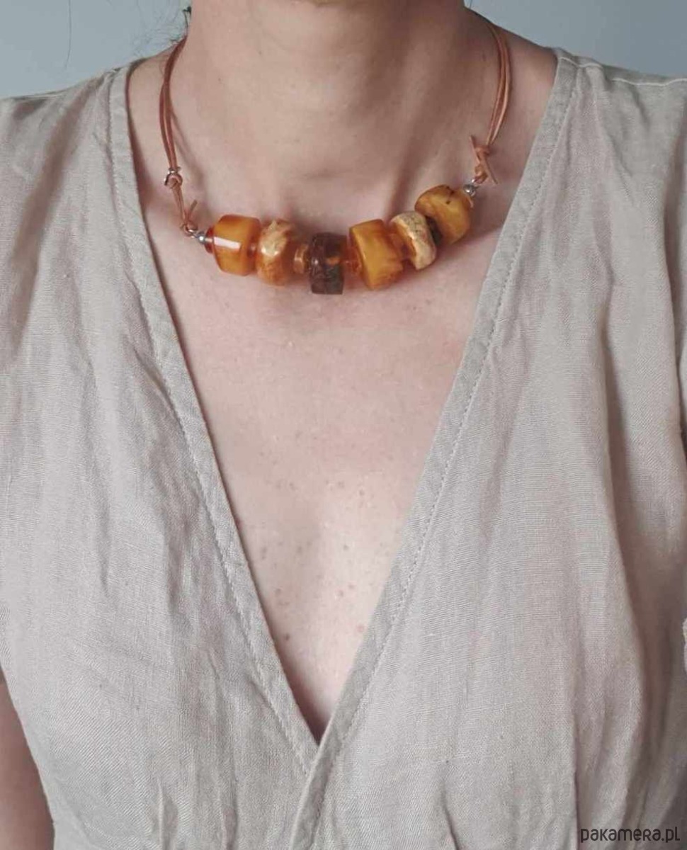 Wymiary: długość samego rzemyka ok. 74 cm (nie ma zapięcia, naszyjnik jest na tyle długi że bez problemu przekłada się przez głowę), można dowolnie zmniejszyć długość. Bursztynki to nieregularne talarki większe i mniejsze, wielkość całego elementu z bursztynu ok 5,5 cm/ 2,5cm, wielkość całego wisiora z chwostem ok. 17 cm.