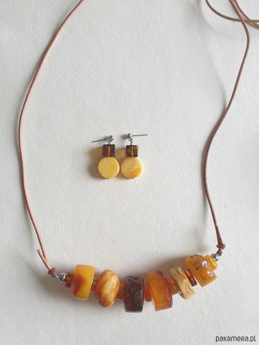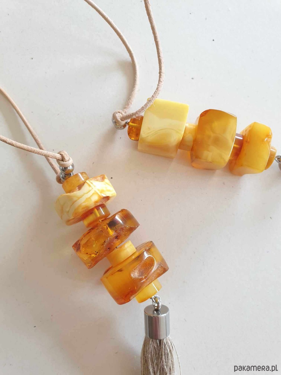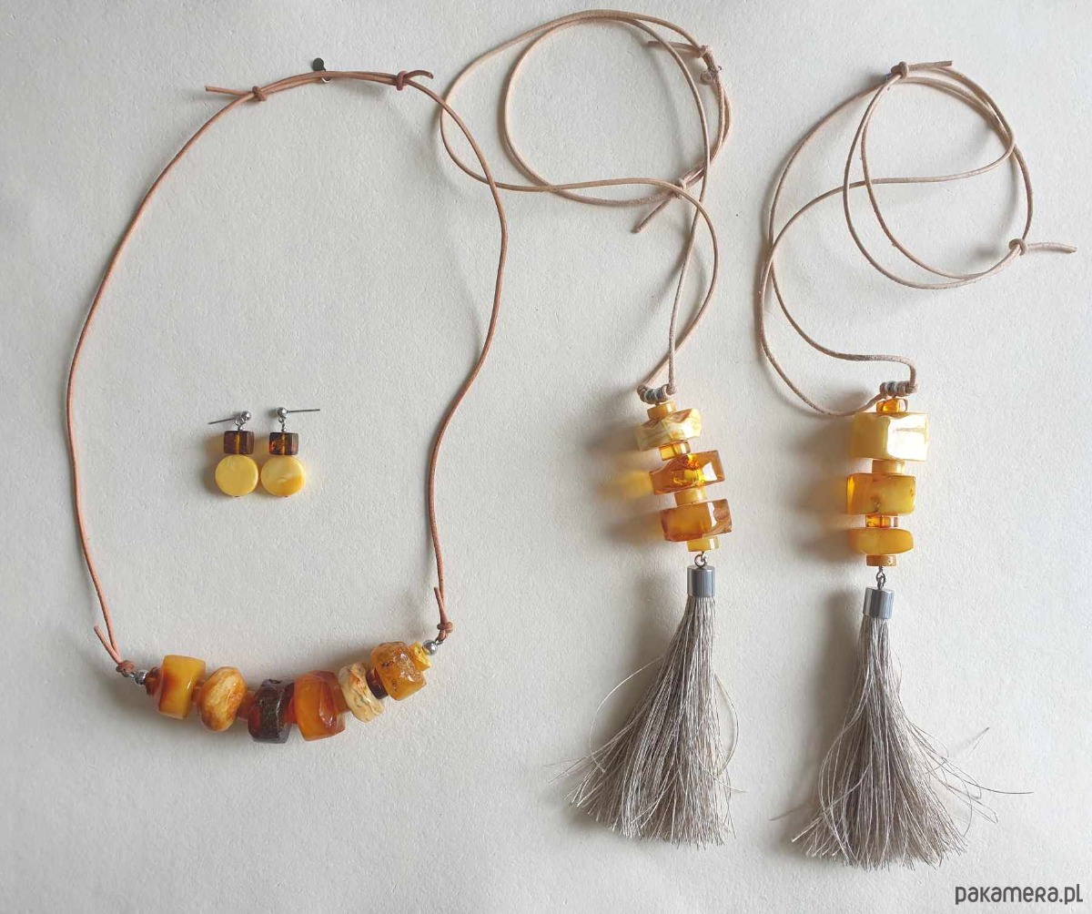 Kolia, 2 x wisior, kolczyki z kolekcji SEA&SUN z bursztynem ręcznie ciętym i szlifowanym, elementami ze stali szlachetnej, lnianym chwostem, na rzemyku naturalnym. Idealne do letnich kreacji, w duchu stylu boho, kolorowych wzorzystych sukienek, ale tez do jednokolorowych minimalistycznych stylizacji. Ta kolekcja inspirowana letnim słońcem i morzem, tworzona z bursztynu i amazonitu.