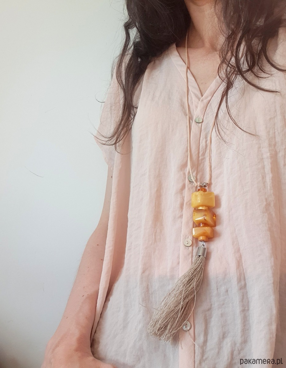 Duży wisior z bursztynem i lnianym chwostem, żółty, geometryczny.