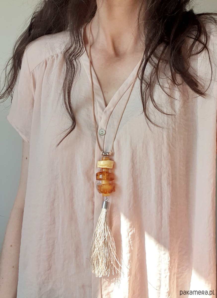 Wymiary: długość 42-69 cm, średnica bursztynowych nieregularnych talarków ok 2, 3 cm, grubość ok 1 cm, długoś ccałego elemeentu z bursztynami ok 12 cm.