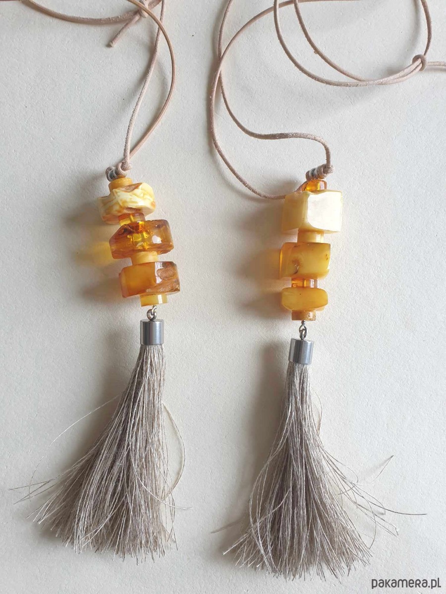Duży wisior z bursztynem i lnianym chwostem, miodowy, talarki