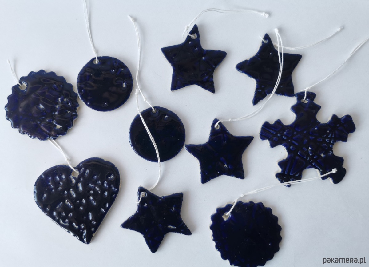 Uroczy komplet granatowych,ręcznie lepionych i szkliwionych ozdób na choinkę.