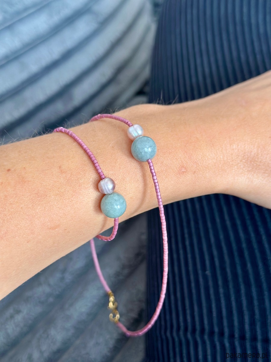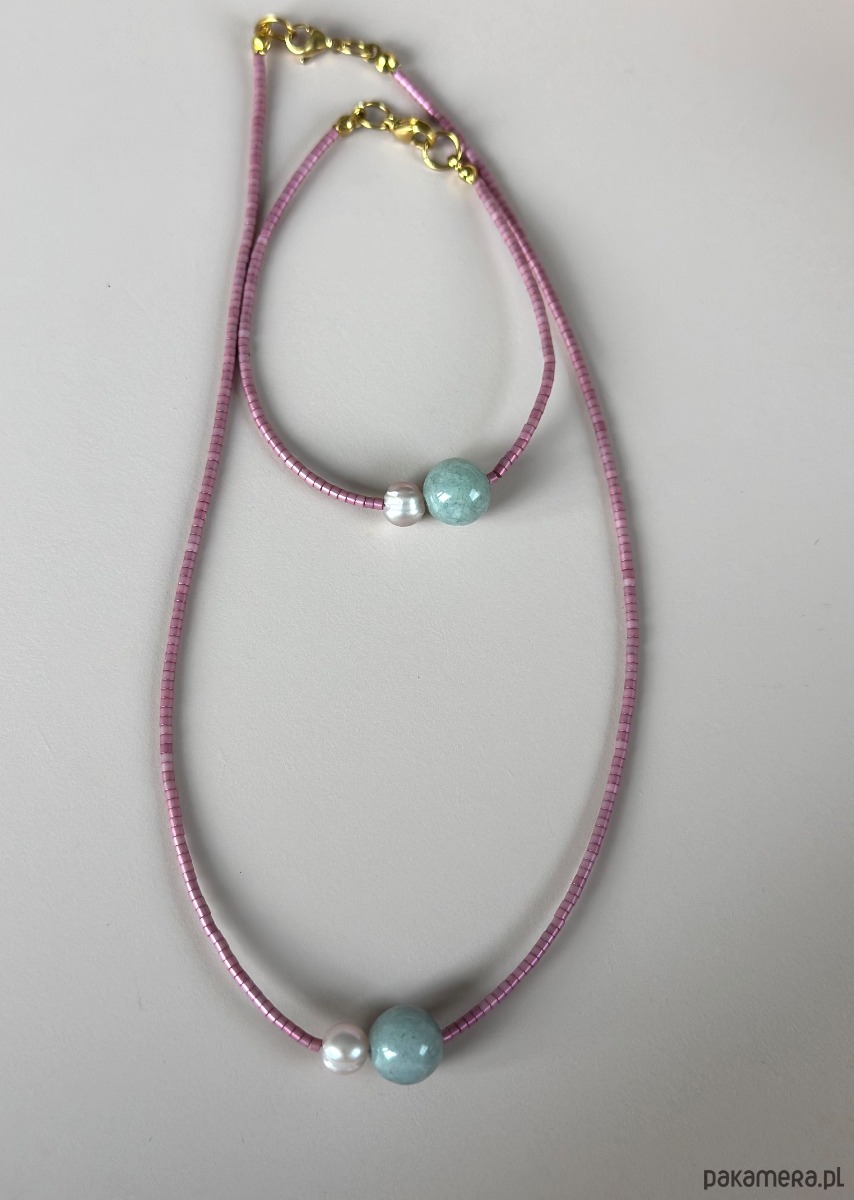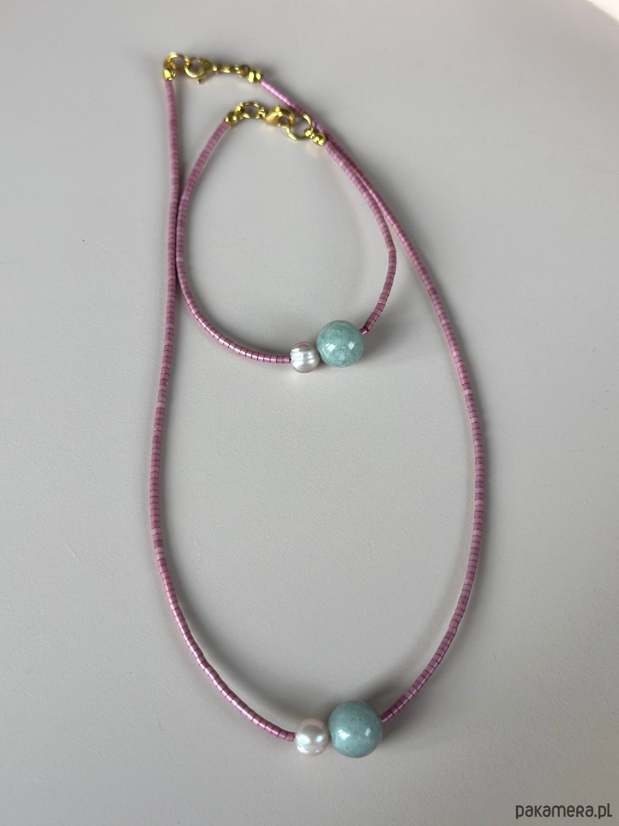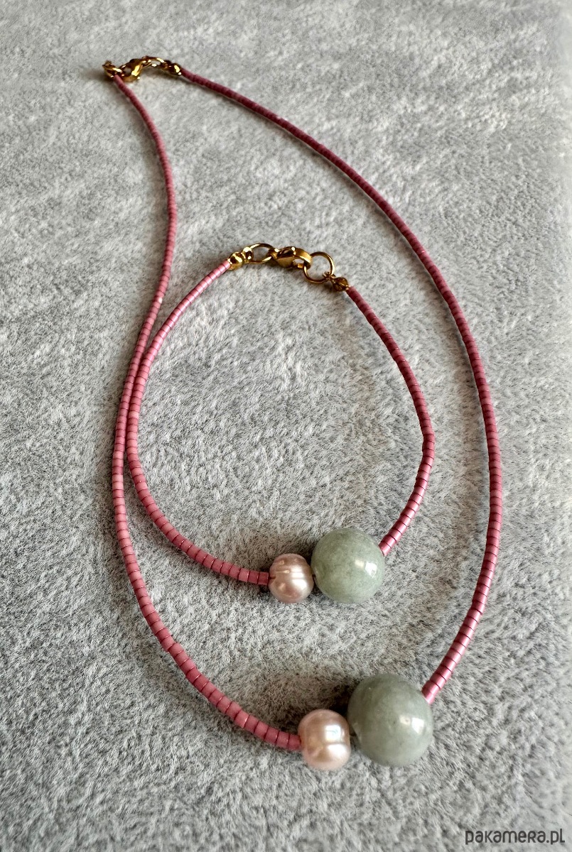 Piękny minimalistyczny komplecik wykonany ręcznie przy użyciu drobnych koralików w kolorze perłowego różu . Wisienka na torcie jest Jadeit i Perła naturalna która stanowi mocniejszy element.