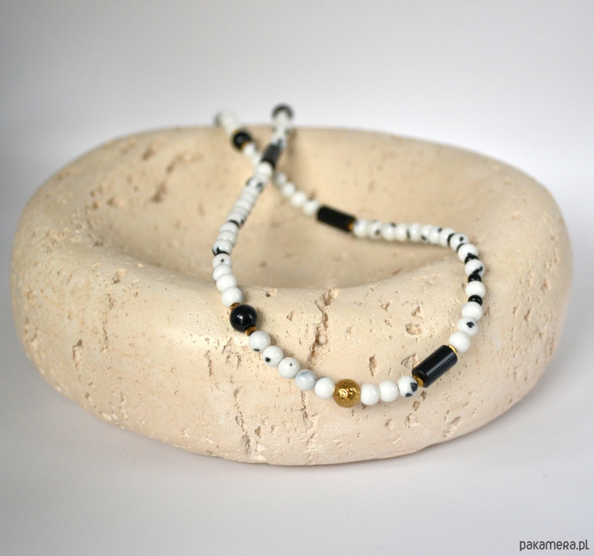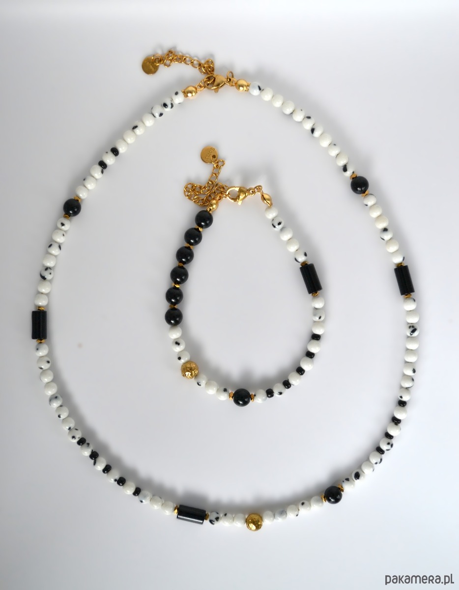 Naszyjnik typu choker i bransoletka z białego jaspisu dalmatyńskiego. Każda część kompletu dodatkowo z podłużnych oraz okrągłych koralików z czarnego agatu plus przekładki ze stali nierdzewnej (kulka i malutkie dyski) w kolorze złotym.