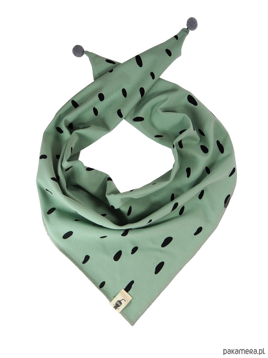 Czapeczkę beanie wykonano z jednej warstwy, z tyłu posiada zakładki co sprawia, że ładnie układa się na główce dziecka. Chusta posiada ozdobne pomponiki.