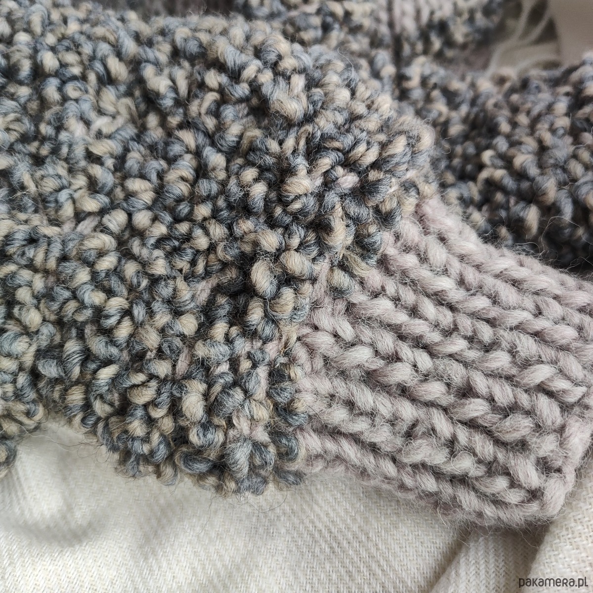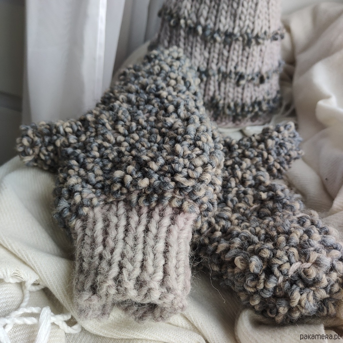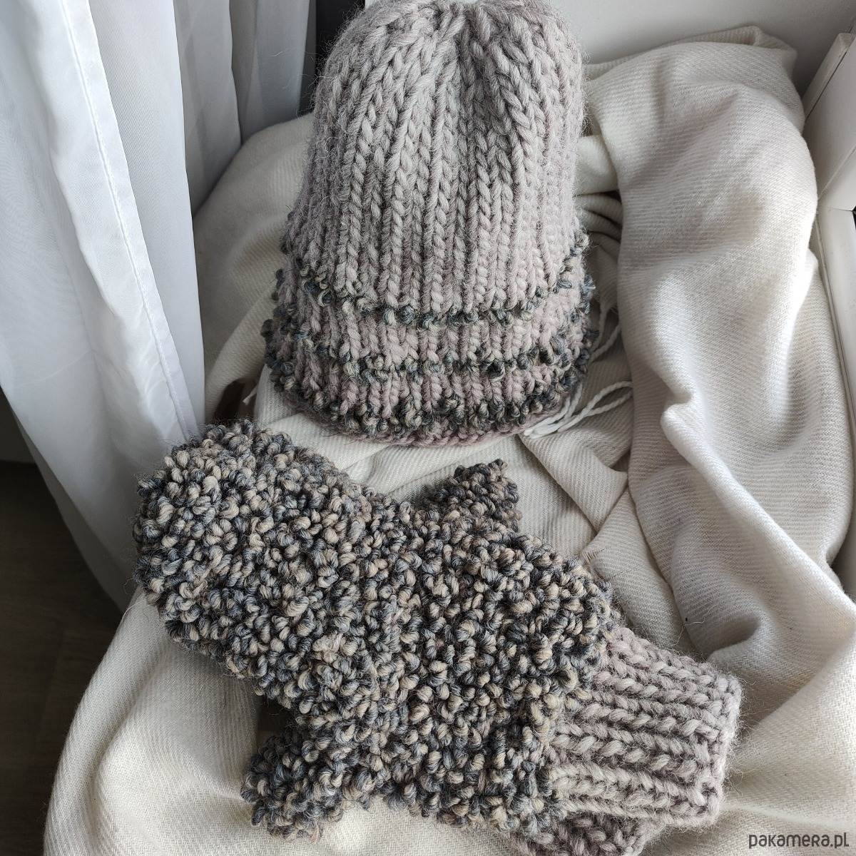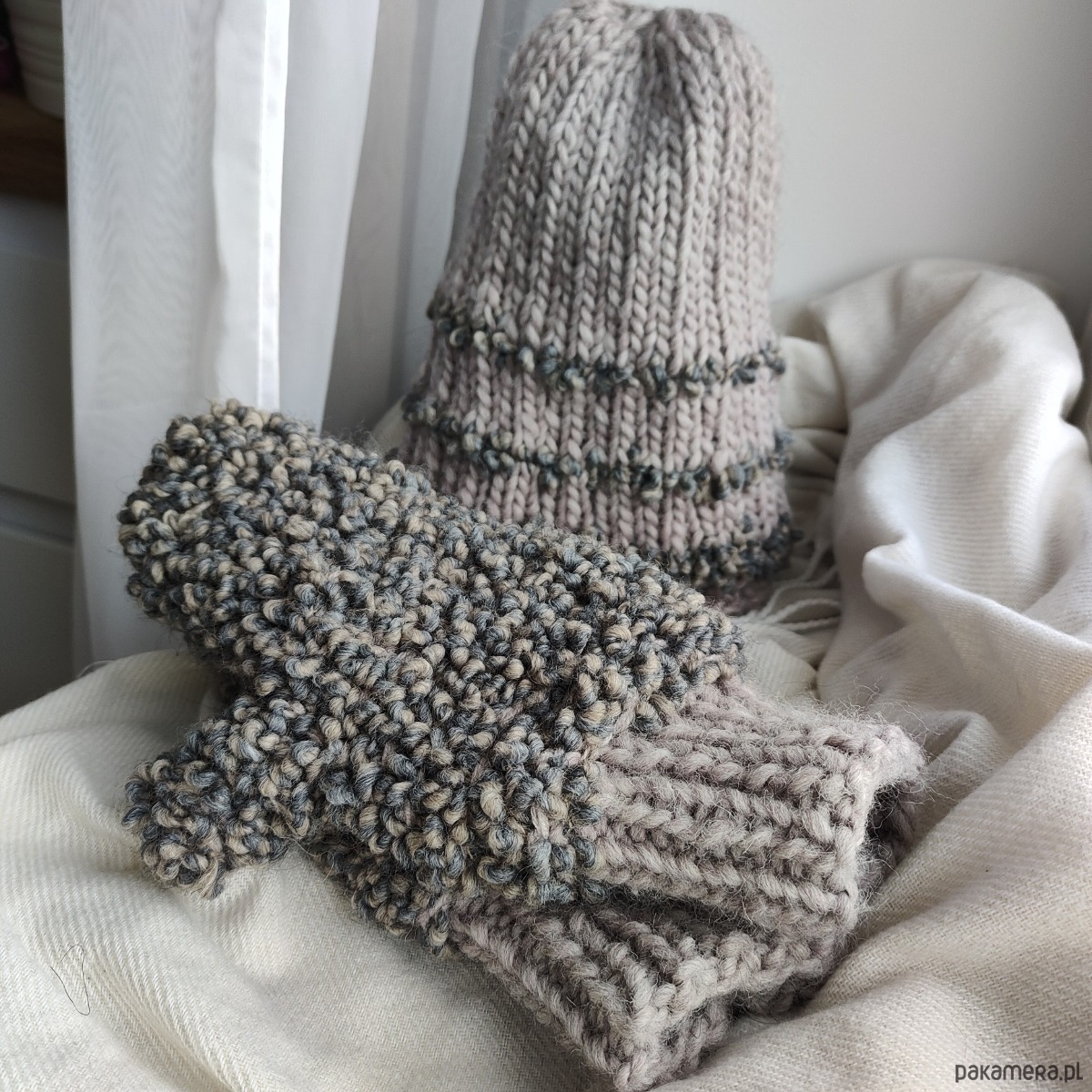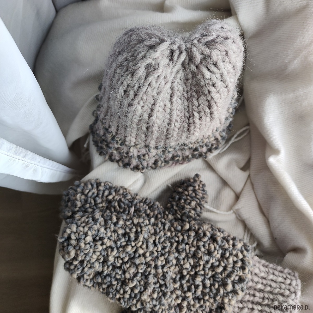 Komplet składający się z czapki i rękawiczek z jednym palcem w kolorze szaro-beżowym. Dobrze dobrane surowce będące połączeniem wełny alpaki merynosa owczej z wiskozą dają doskonałe właściwości termiczne i higroskopijne 🐑 wszystko w najmodniejszej teksturze boucle oraz neutralnym kolorze.