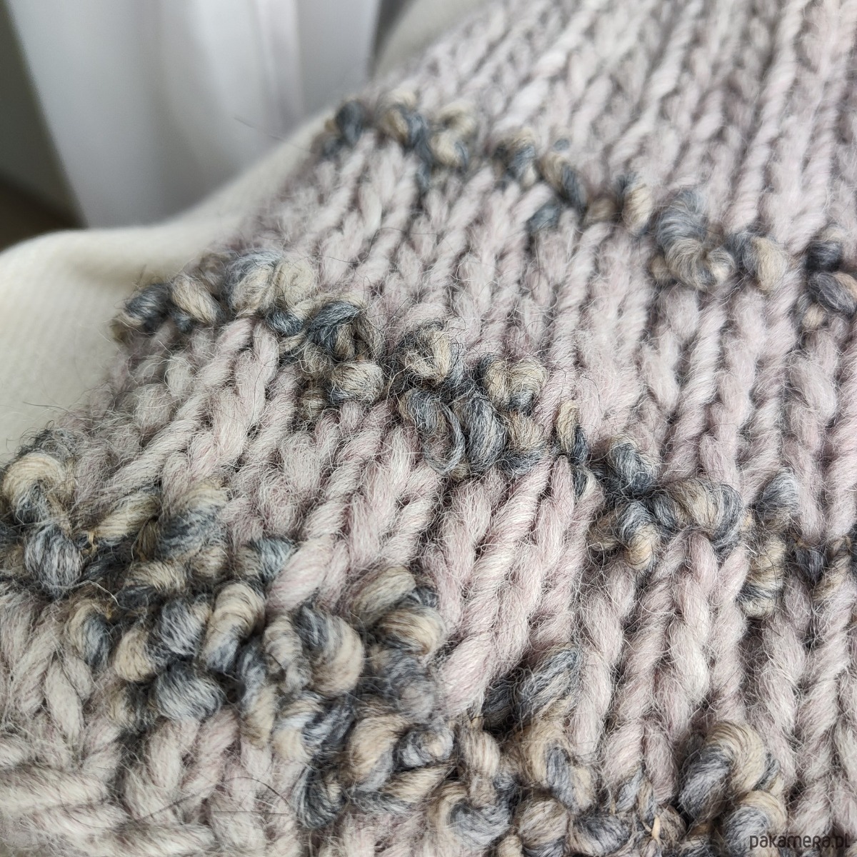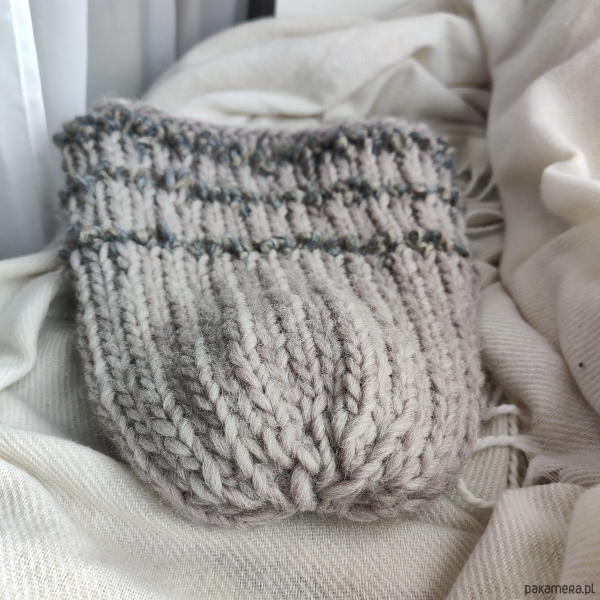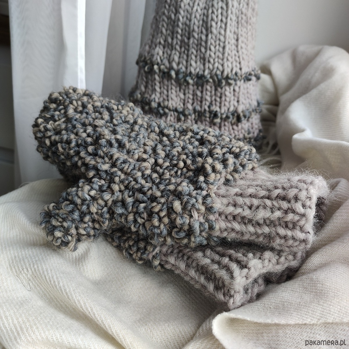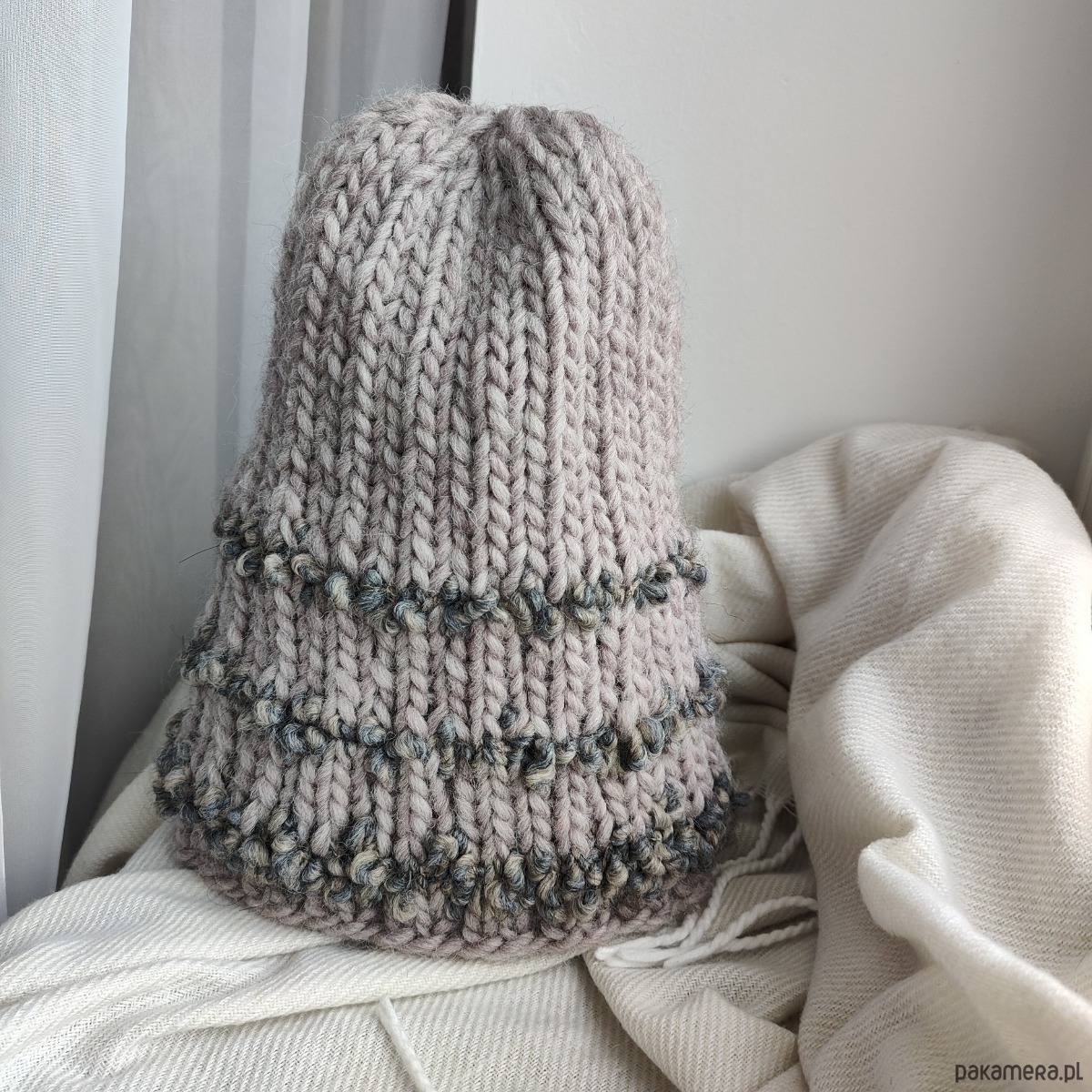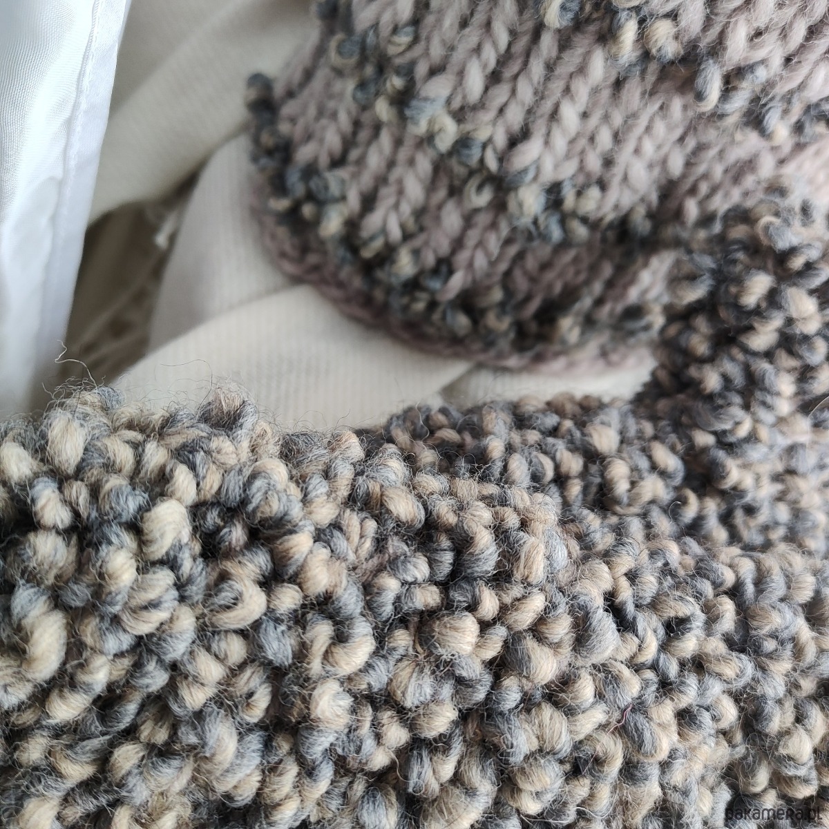 Komplet składający się z czapki i rękawiczek z jednym palcem w kolorze szaro-beżowym. Dobrze dobrane surowce będące połączeniem wełny alpaki merynosa owczej z wiskozą dają doskonałe właściwości termiczne i higroskopijne 🐑 wszystko w najmodniejszej teksturze boucle oraz neutralnym kolorze.