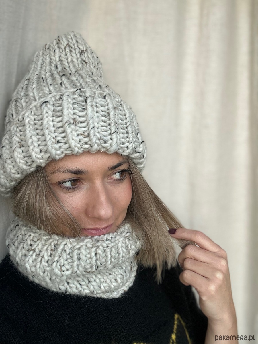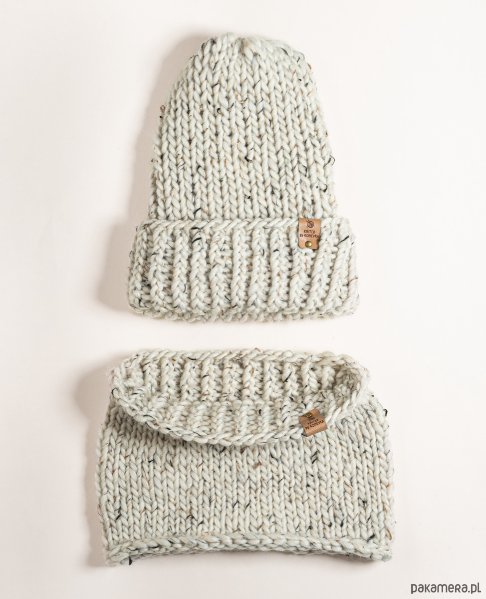 Komplet wykonane z największą starannością w formie obszernej mięciutkiej uniwersalnej rozmiar owo czapy i minimalistycznego komina który szczelnie zakrywa szyjkę.