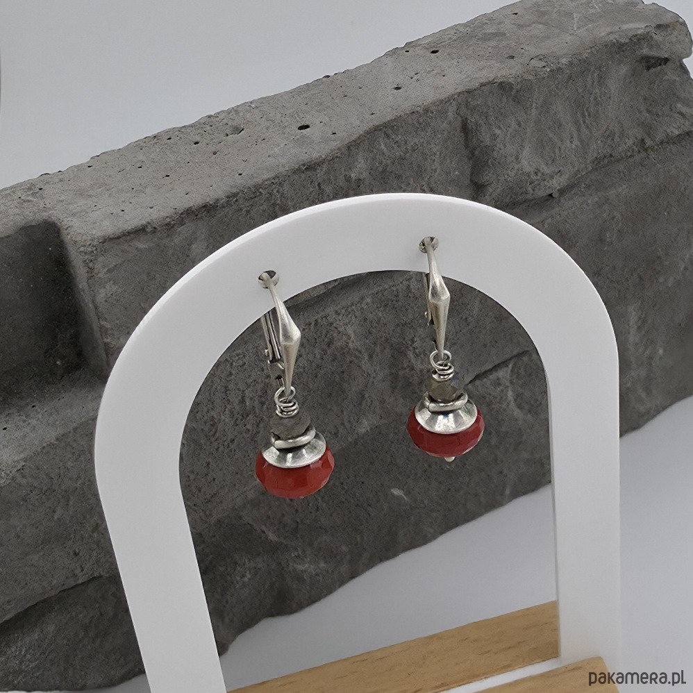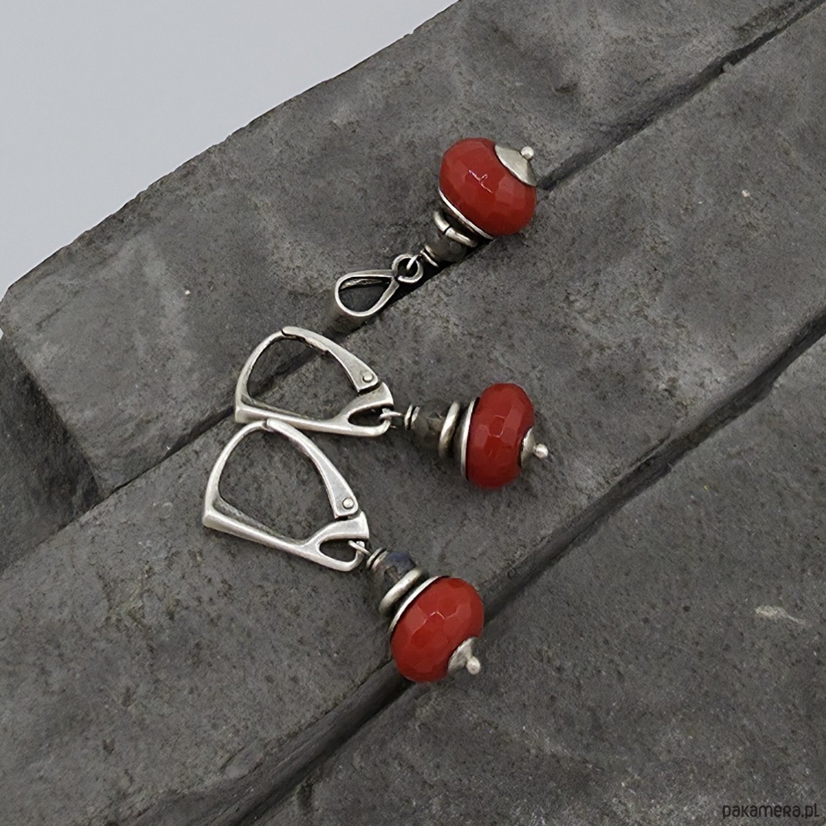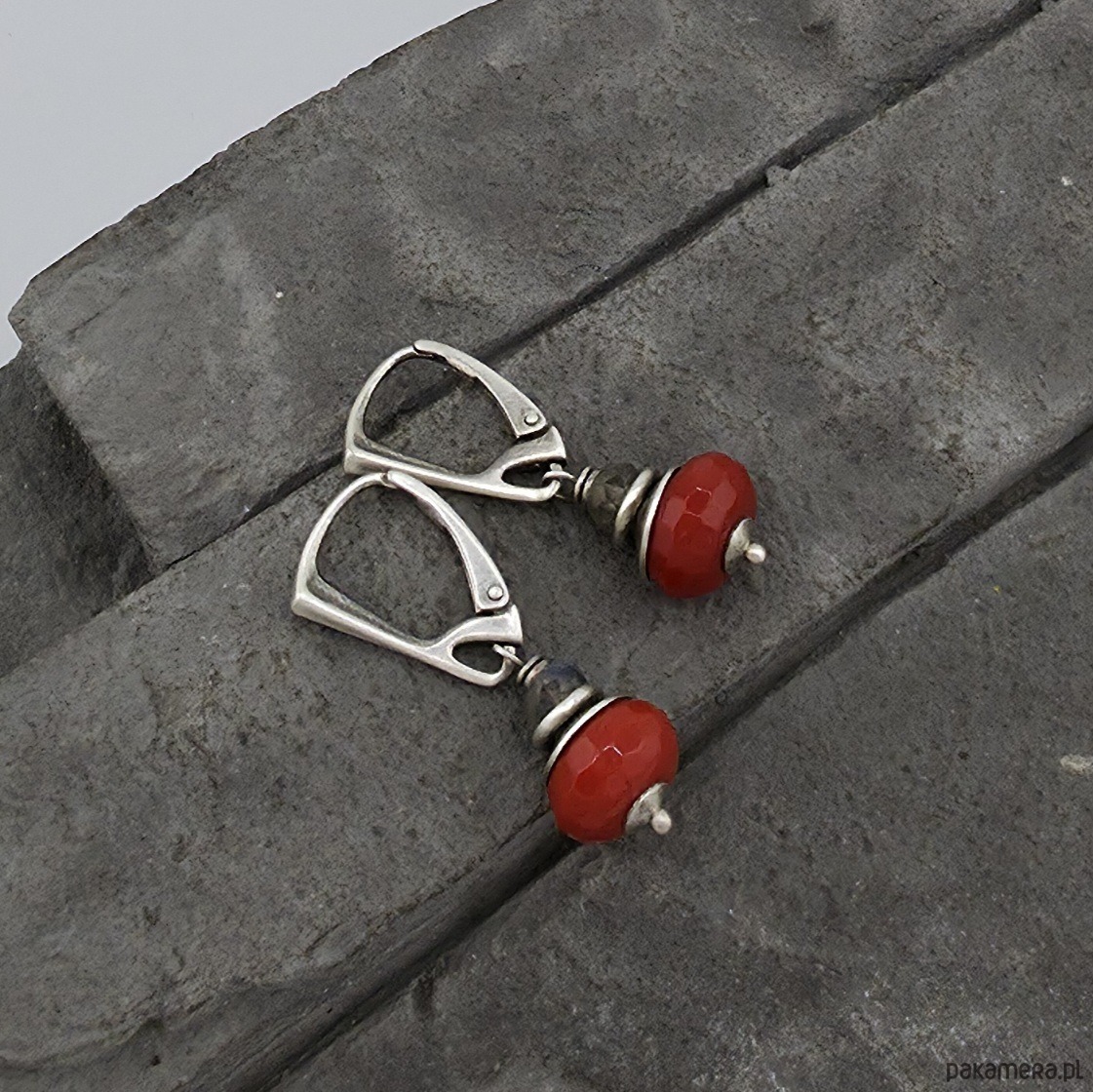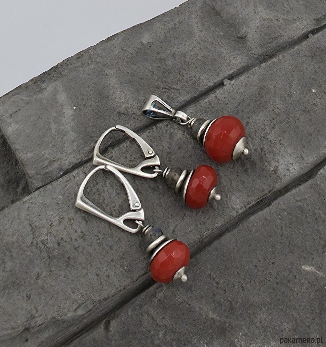 Kobiecy, minimalistyczny komplet wykonany w całości z oksydowanego srebra próby 925 oraz fasetowanych oponek czerwonego kwarcu wielkości ok. 10 i 12x8mm i 5 mm fasetowanych oponek labradorytu. Zapięcia zatrzaskowe typu angielskiego. Całkowita długość kolczyków to ok. 3,5 cm. Ozdobnie zapakowane.