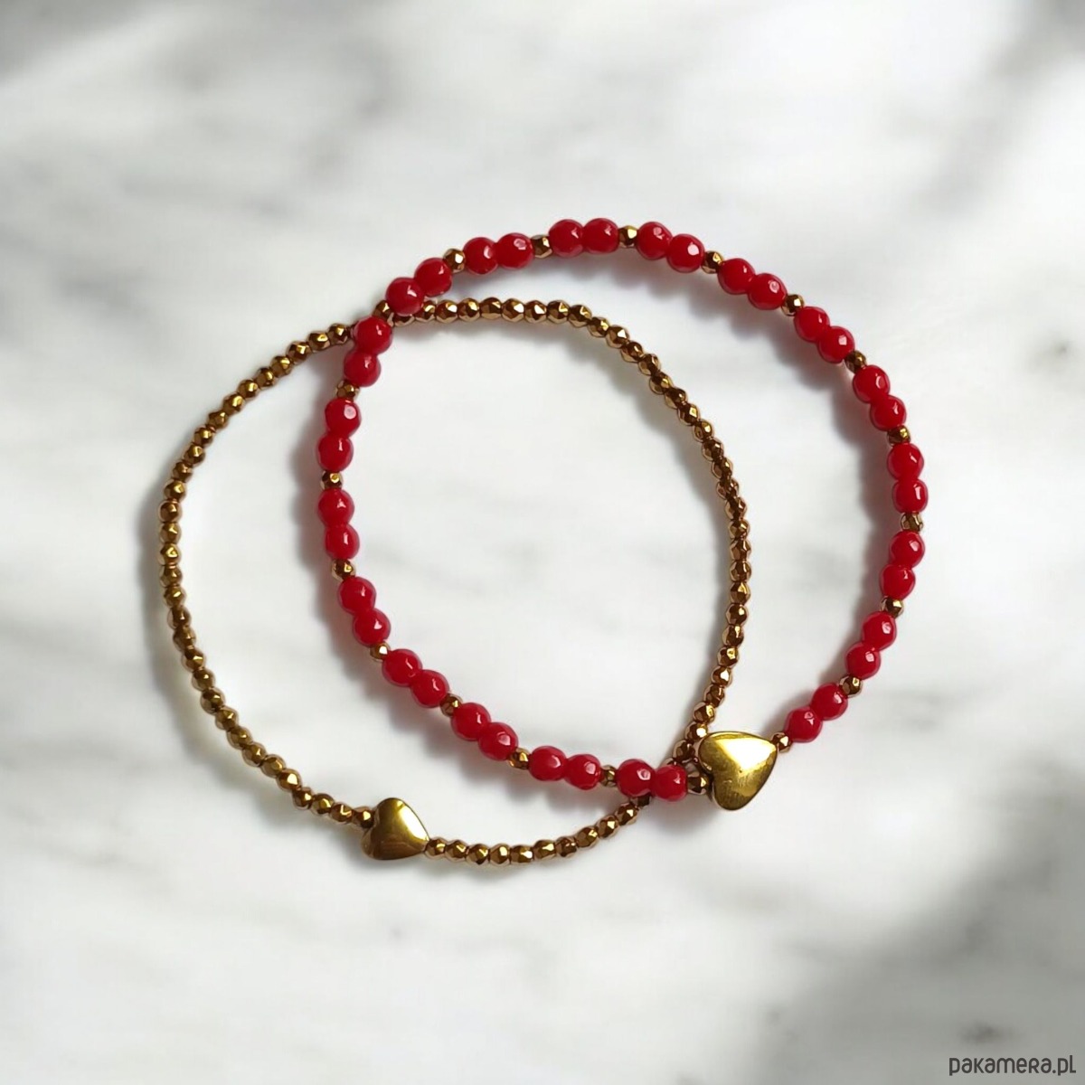 Komplet czerwono-złoty : bransoletki z serduszkami : na prezent